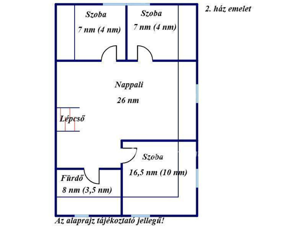 Az emeleten egy 26 nm-es nappaliba érkezünk, melyből 2 félszoba, 1 szoba, illetve egy káddal ellátott fürdőszoba nyílik. Az emeleten hűtő-fűtő klíma is megtalálható.