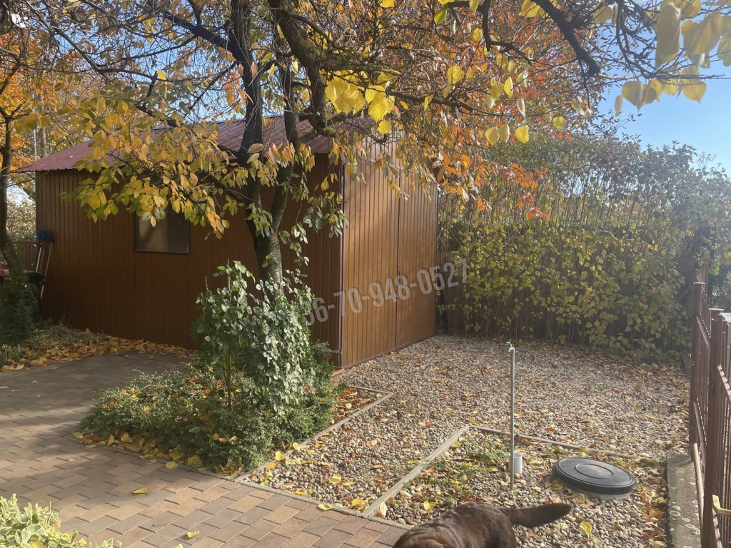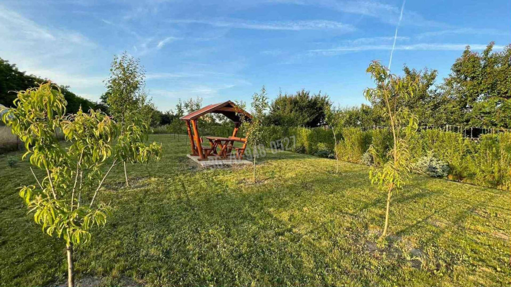 A körbekerített telken mobilgarázs, állattartásra alkalmas melléképületek, fúrt kút és egy rönk filagória kapott helyet, illetve gyümölcsfák és örökzöld növények.