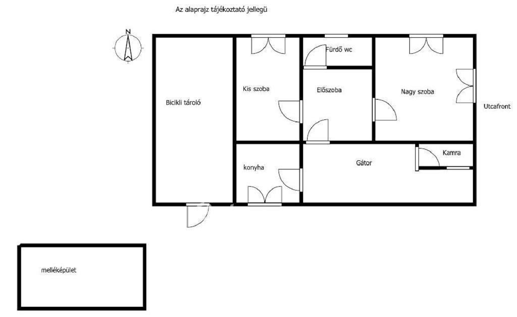A ház elosztása tágas, napfényes ingatlan. Az épületben 2 szoba, fürdőszoba wc-vel, előszoba, külön bejáratos konyha és kamra található, kerékpártárolóval melléképülettel.