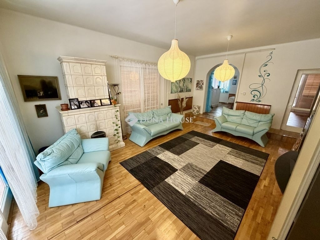 A nappaliban egy hangulatos cserépkályha található, amely nemcsak esztétikai élményt nyújt, hanem hatékony kiegészítő fűtési megoldásként is szolgál.