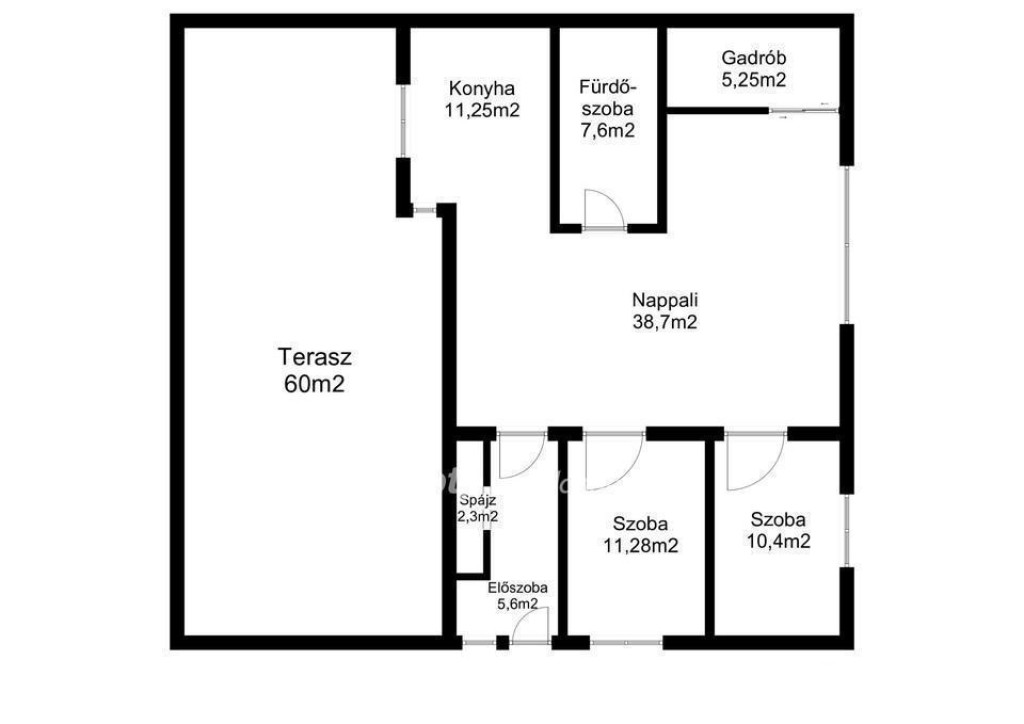 Az ingatlan elrendezése: tágas konyha étkező nappali, 2 hálószoba, gardrób, spájz, előszoba, valamint zuhanyzós és kádas fürdőszoba.