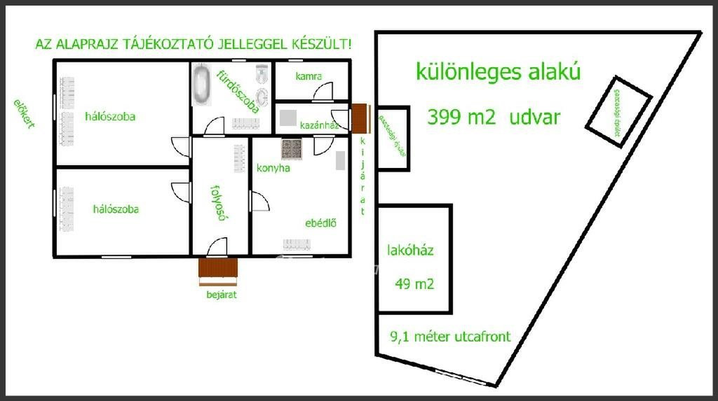 Tipp Topp különleges alakú telken 399 m2, utcafrontja 9,1 méter, a melléképületek- tárolók, a kertben, gyümölcsfák nagyszerű kilátást adnak napfényes étkezőből.
