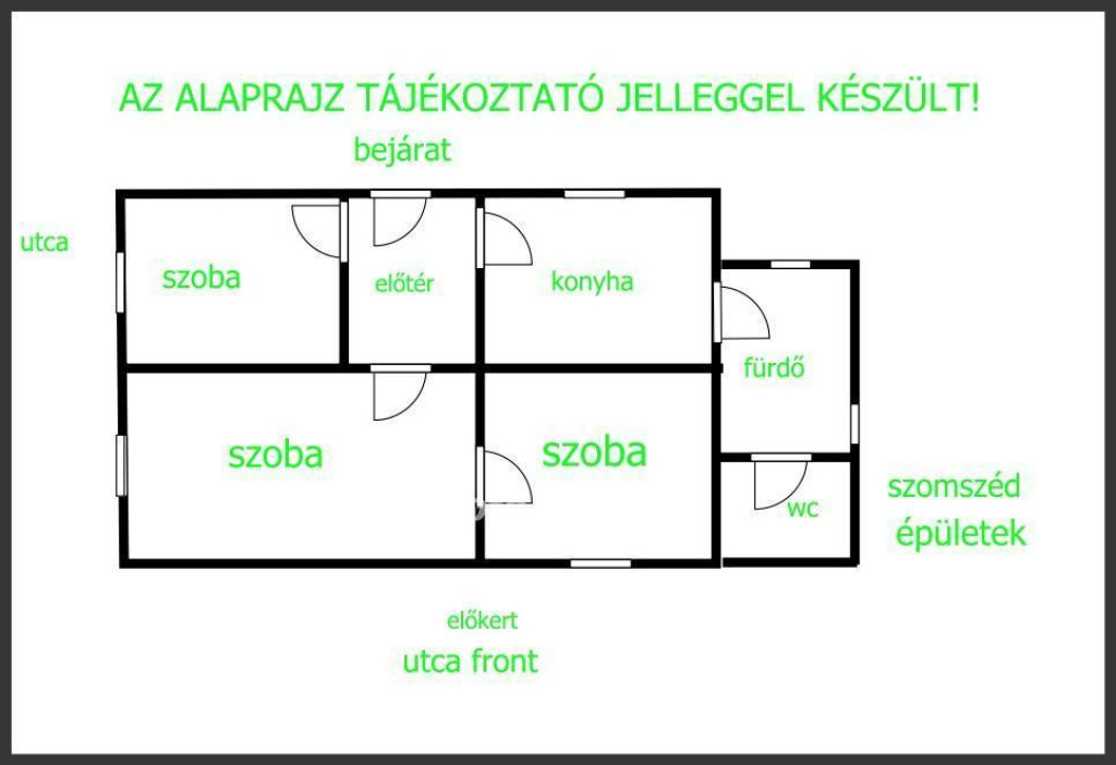 Előszoba, 2 szoba átjárható +félszoba, konyha, fürdőszoba wc+vel.