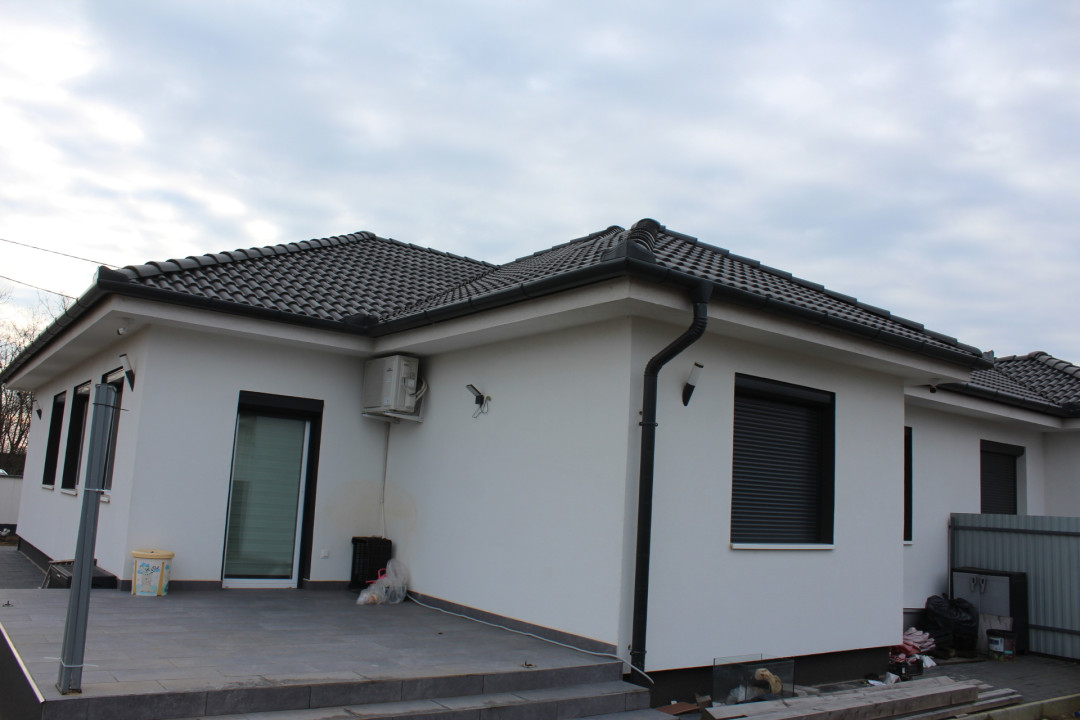 Beton alapon tégla falazat, 15 cm-s szigeteléssel. Fa tetőszerkezet, BRAMAC, beton cserép fedéssel. 2023-s építésű, korszerű, hőszigetelt műanyag nyílászárók. Modern kialakítású, nagyon jó elosztású, duplakomfortos családi ház 40 m2-s konyha, étkező, nappalival.