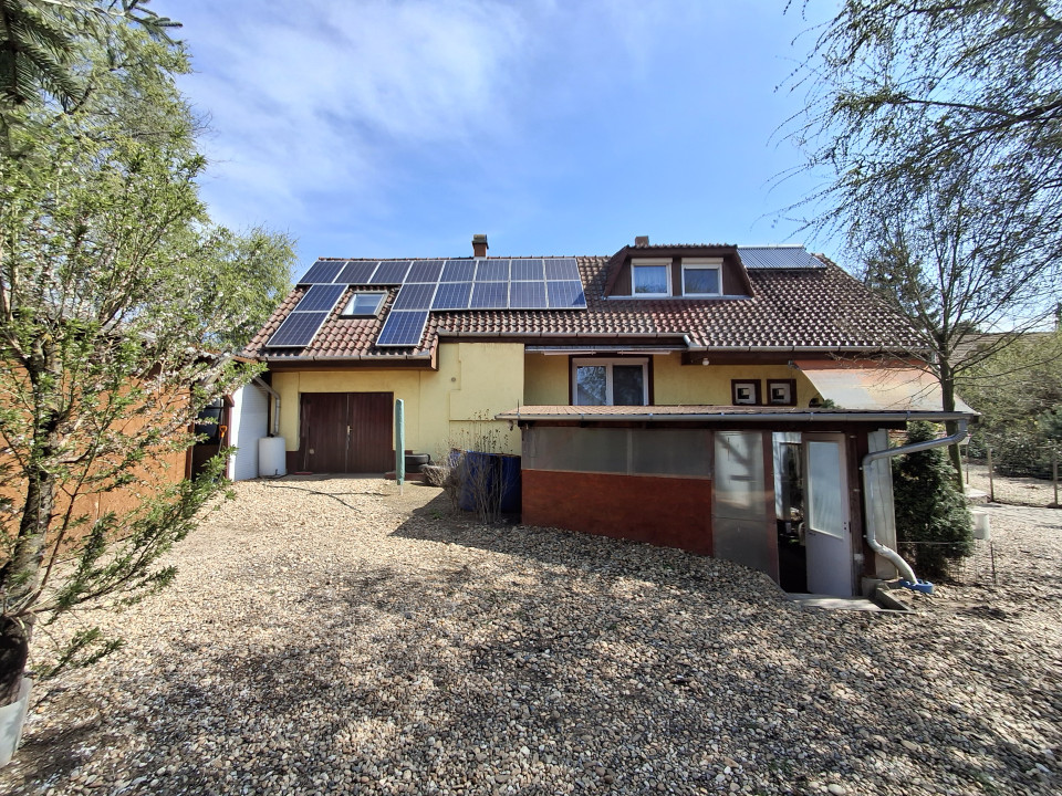 - - a háztetőn napkollektor és napelem van elhelyezve