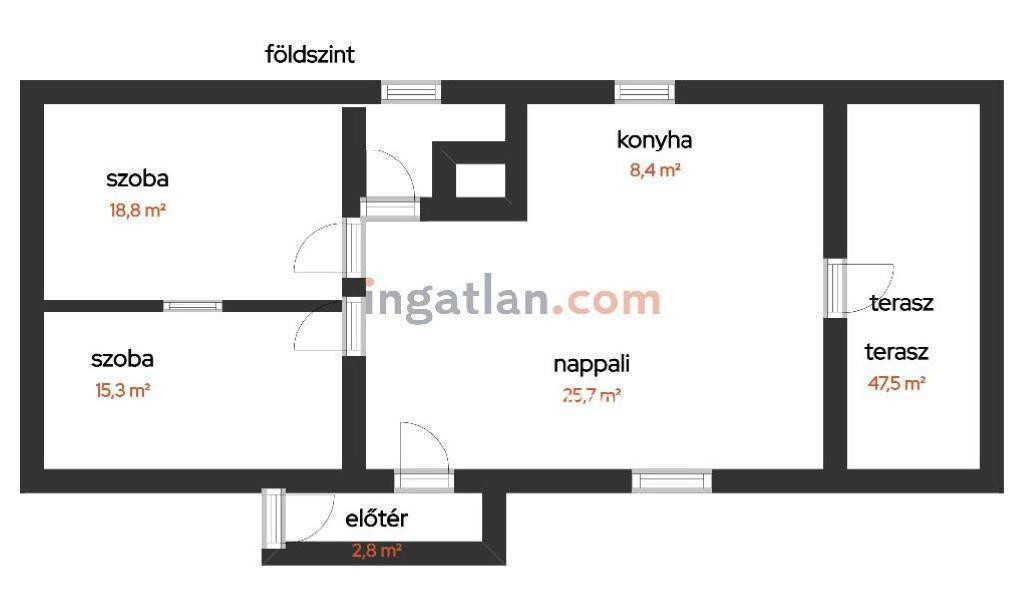 Helyiségek: földszint: előszoba, amerikai konyhás nappali, 2 szoba, fürdőszoba, külön WC, 73 m2 terasz; tetőtér: 2 db erkély, 3 szoba, konyha étkező egyben, folyosó, fürdőszoba, külön WC.