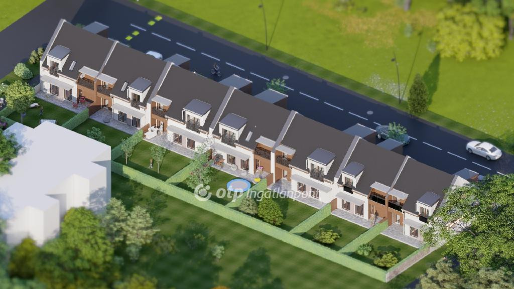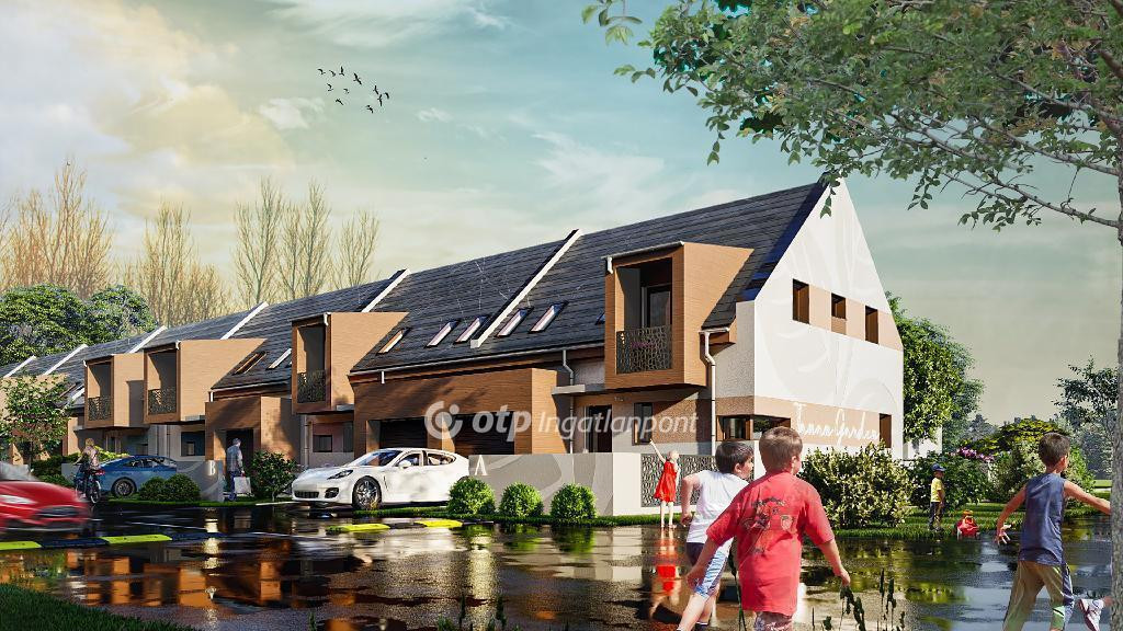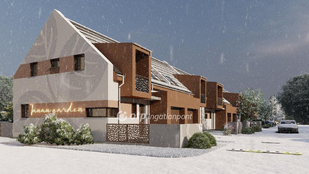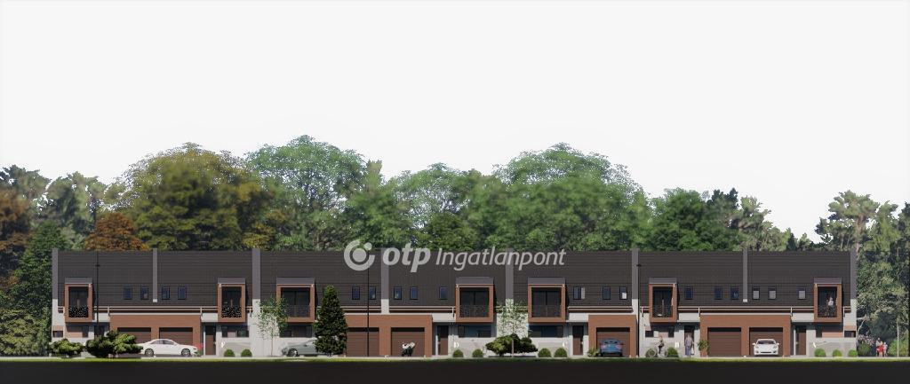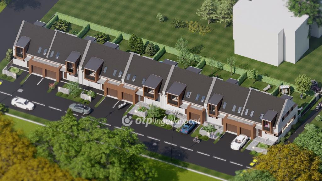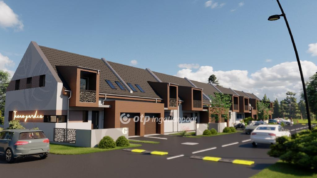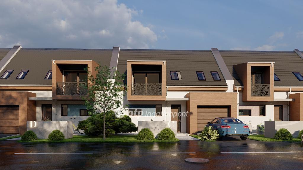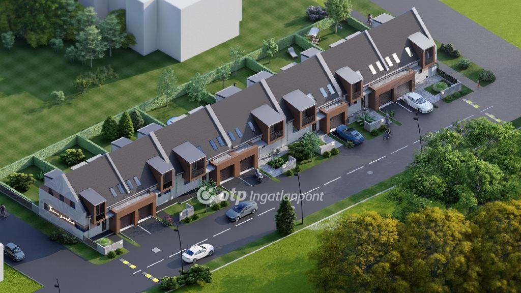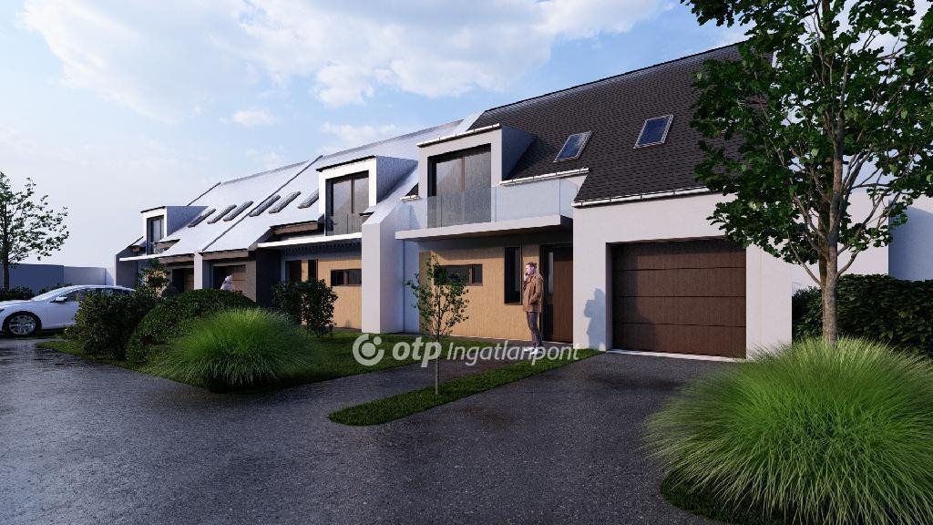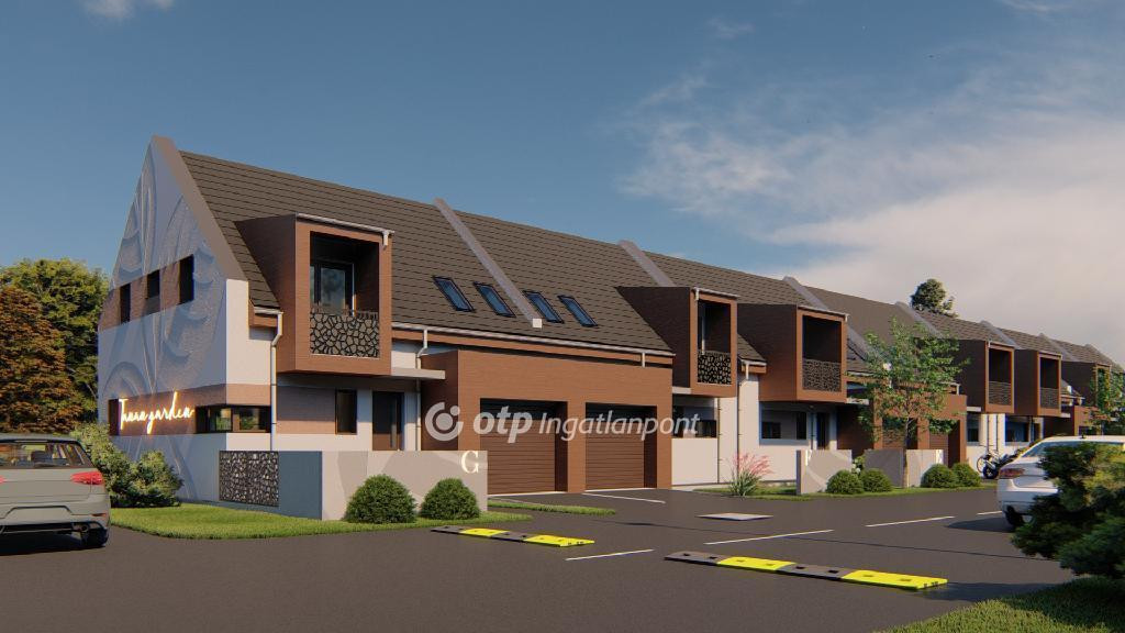 ELADÓ Igényes új építésű 7 db családi házból álló saját kerttel is rendelkező sorház, amely kényelmes és tágas otthona lehet családoknak. A hirdetett G ház mérete 123 nm. A földszint alapterülete 67 nm, az emelet mérete 56 nm. A földszinten mosdó, konyha, étkező, nappali, közlekedő, garázs és terasz található, valamint egy 78 nm-es saját kertrész is tartozik hozzá. Az emeleten 1 szoba, 2 félszoba, közlekedő, fürdő, gardrób, wc, terasz és loggia kerül kialakításra.