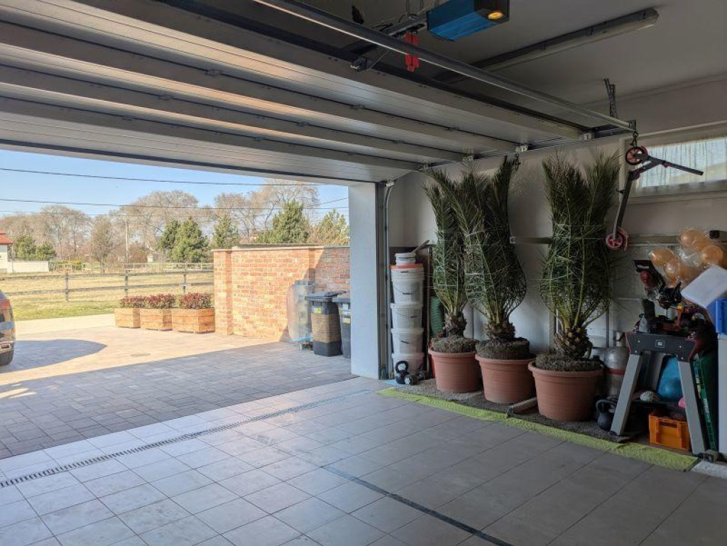 A gondozott kertben fúrt kút, automata öntözőrendszer és kerti zuhanyzó található. A dupla garázs kényelmes parkolást biztosít.
