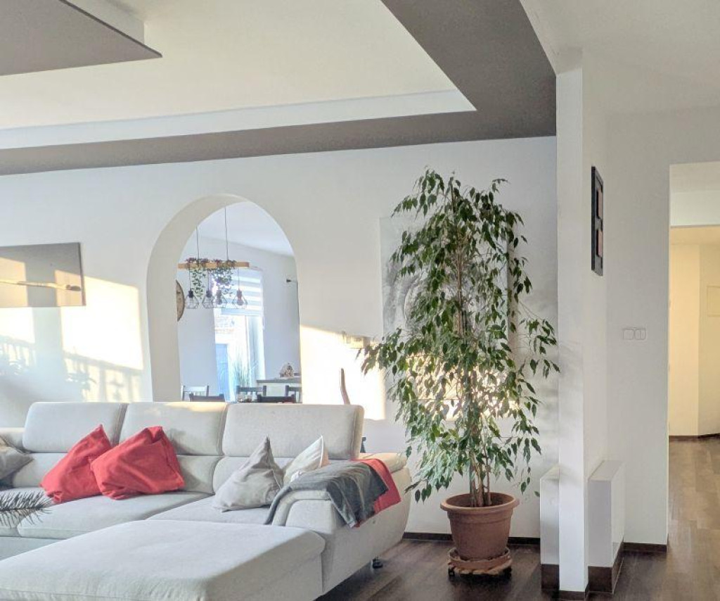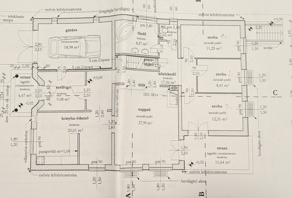Helyiségek: 3 hálószoba, tágas amerikai konyhás nappali (28 m² + 20 m²), fürdőszoba sarokkáddal, külön WC, spájz és egy 19 m²-es garázs.