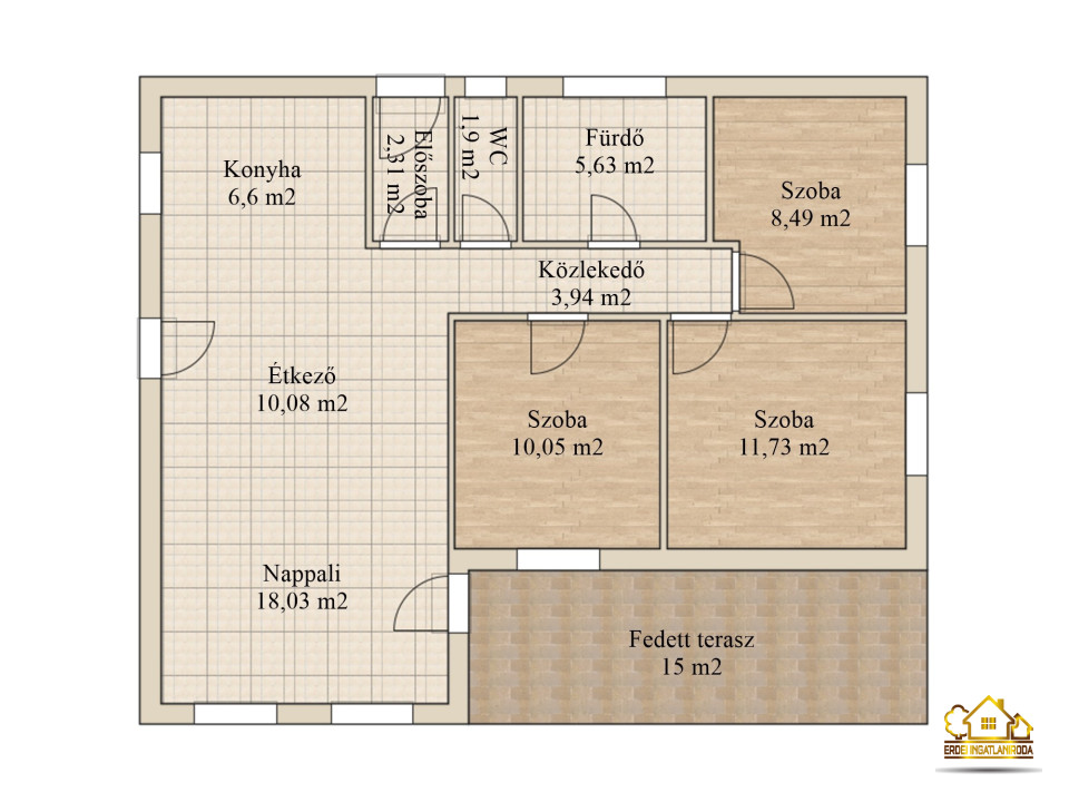 Az ingatlan hasznos alapterülete 79 m², fedett terasza 15 m², külső tárolója 3 m².