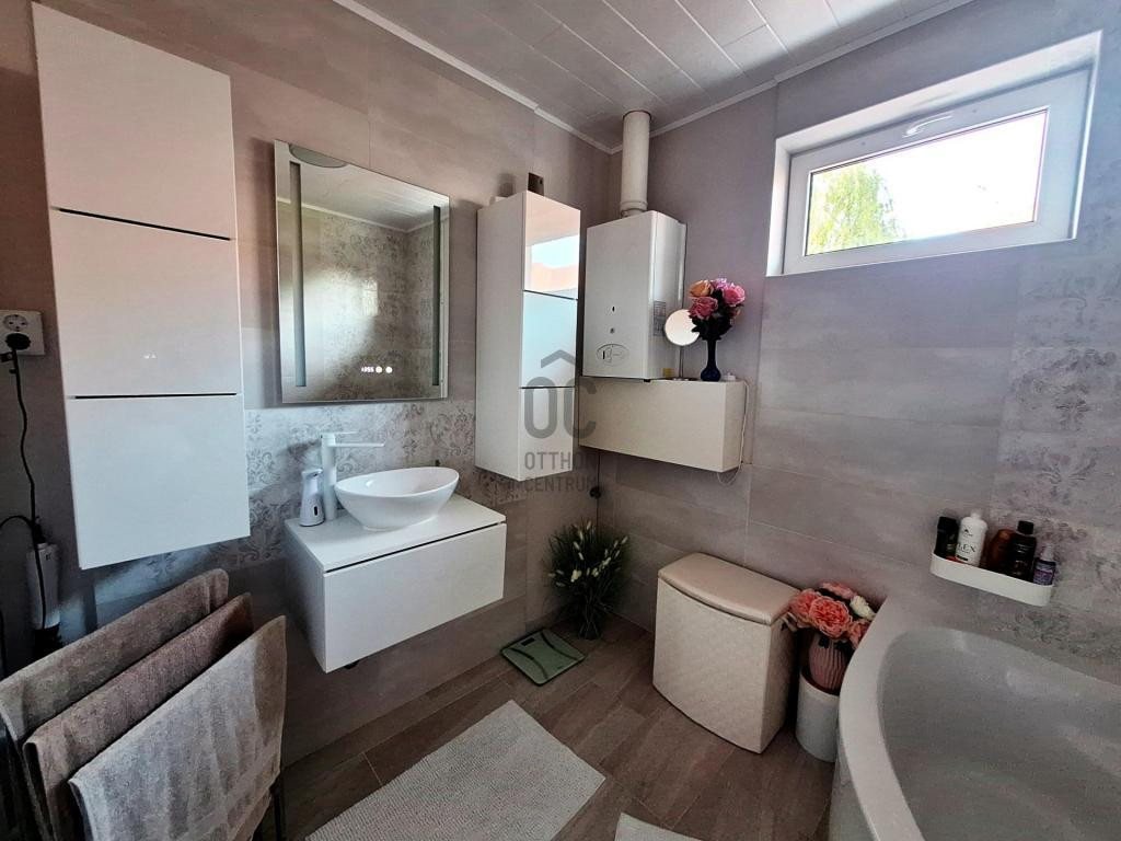 A téglaépítésű, 94m²-es, hőszigetelt otthon egy 350 m²-es, parkosított telken helyezkedik el. Korszerű műanyag nyílászárók, redőnyök, szúnyoghálók és zsindelytető biztosítják a kényelmet és a tartósságot. A fűtésről turbó gázcirkó, míg a 5 kW-os klíma gondoskodik a megfelelő hőmérsékletről télen-nyáron.