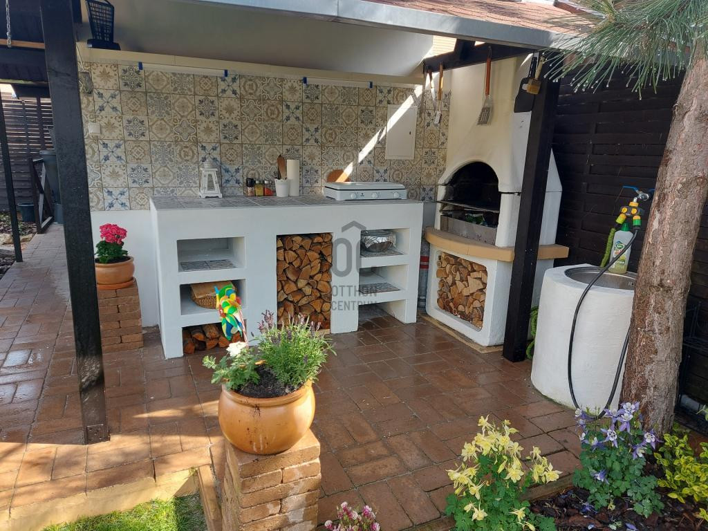 A nyári konyha, a beépített öntözőrendszer, valamint a két fából készült kerti tároló praktikus kiegészítői a mindennapoknak.