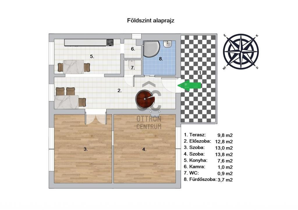 - FÖLDSZINT felosztása: előszoba, 2 szoba, konyha-étkező, kamra, fürdőszoba, WC, terasz.
