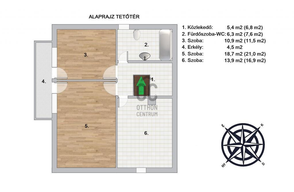 - Jelenlegi felosztása a tetőtérben: közlekedő, 3 szoba, Fürdőszoba-WC, erkély.