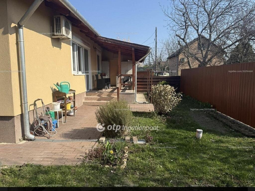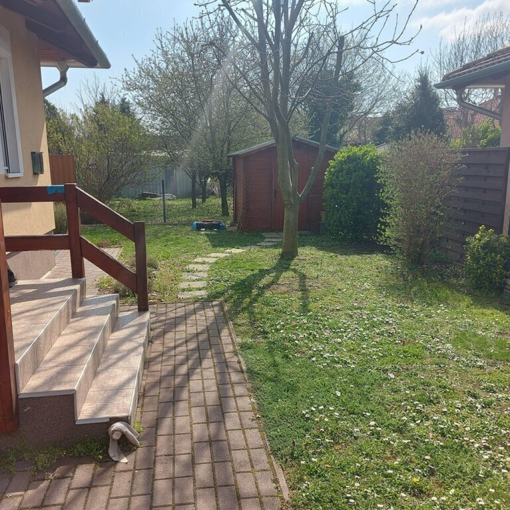 Az ingatlan 340 m2-es telken, 73 m2-en beépített, egy 11 m2-es fedett terasszal illetve masszív fedett gépkocsi tárolóval is rendelkezik. A két ikerház dupla falazással van elválasztva. A kertben még egy faházikó is található amely elnyeli a kerti szerszámokat, locsoló eszközöket. A környék csendes, rengeteg a zöld növény, fák a telken és a szomszédoknál is, madárcsicsergős, igazi kikapcsolódást nyújtó környezet.