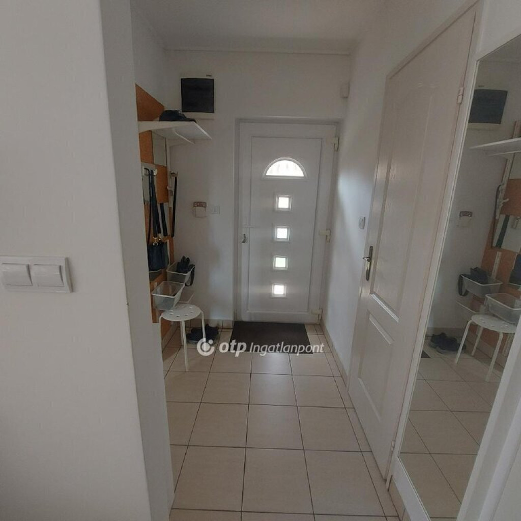 A lakásban egy szép előtér, az ebből nyíló tágas, zuhanyzófülkés fürdőszoba, külön WC, illetve egy szoba nyílik. Továbbhaladva egy amerikai konyhás világos, napfényes, déli tájolású nappaliba érkezünk. Minden hófehér IKEA bútorokkal szerelt, meleg, tiszta, finoman elegáns és otthonos. Fehér konyhabútor, igényes, IKEA gépekkel szerelt, modern, pratikus, a hozzátartozó fehér étkezőgarnitúrával. Minden letisztult, a mai igényeknek megfelelő. A konyhában találtahó egy nagyteljesítményű 3,5 kw-os Daikin klímaberendezés is. Egy kisebb folyosón áthaladva a nappalin jobbra és balra található a hálószoba és mégegy szoba. Egy egyedi tervezésnek köszönhetően ezen szobákban a folyosó folytatása és a válaszfal két hatalmas falba süllyesztett tükrös gardróbszekrényt rejt. A tetőtér faszerkezetű, OSB lapozva létrás feljáróval, pakolható. Alacsony fenntartási költségek, napfényes, világos terek. Az előkert füves és néhány fa is díszíti, Játszótérnek is alkalmas. A hátsó kert kisebb, inkább díszkert , de a terasz fedettsége a kellemes, meleg, déli tájolású térben hűvös árnyékolt teret eredményez.