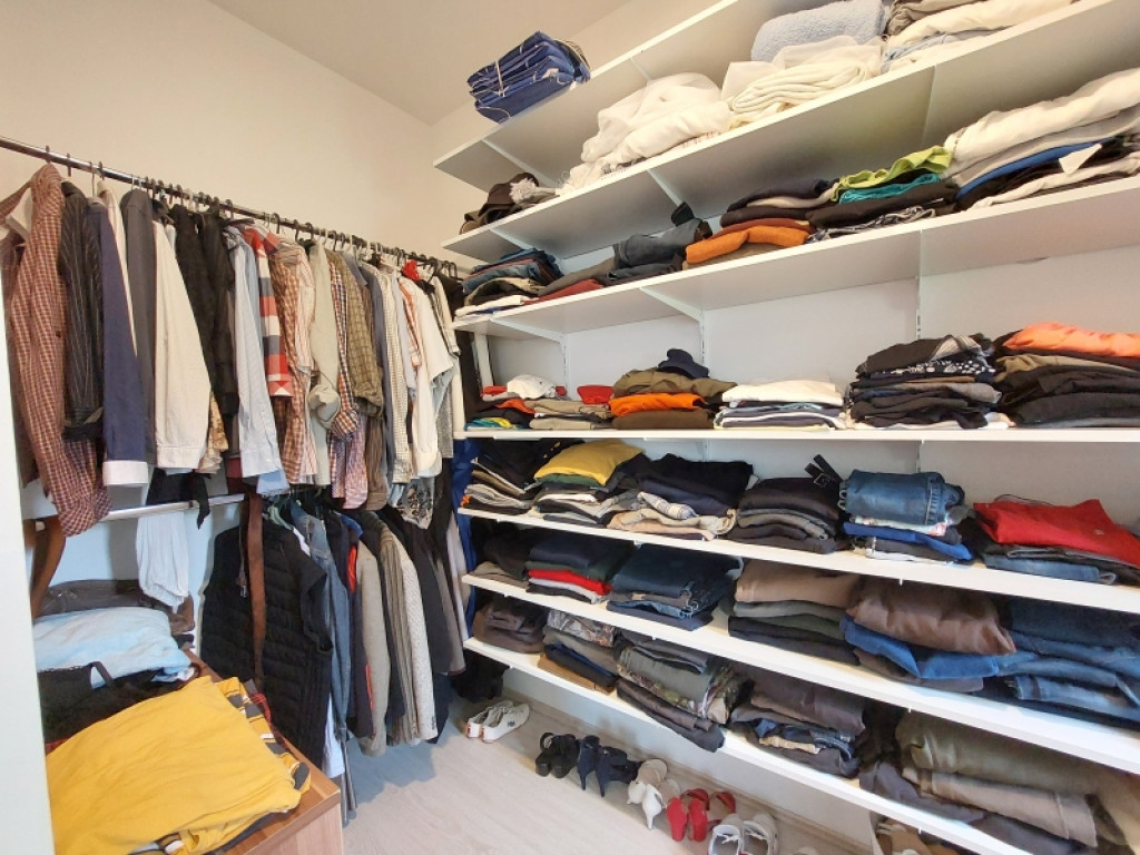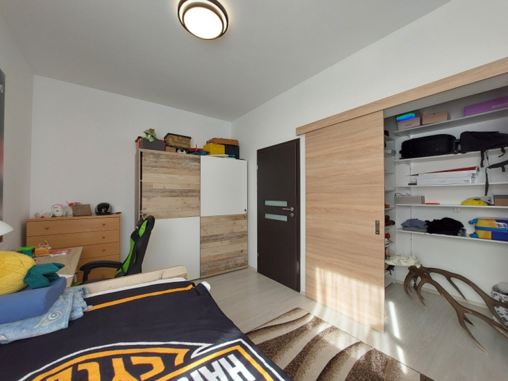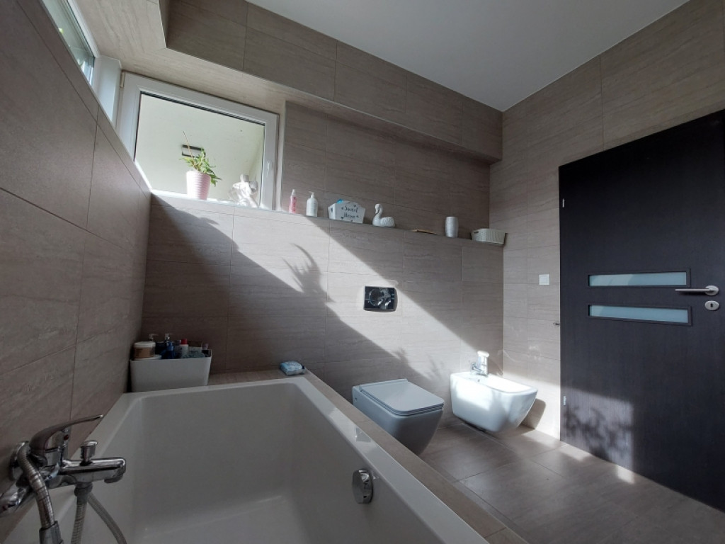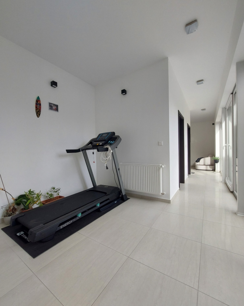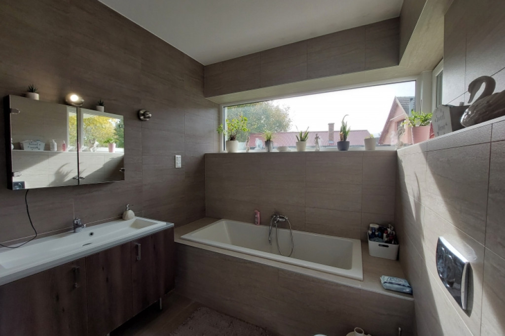 Az ingatlan elrendezése átgondolt, praktikus és kényelmes. Három világos, tágas szoba található benne, melyek közül kettőben külön beépített gardróbszoba kapott helyet. Két modern, igényesen kialakított fürdőszoba szolgálja a kényelmet: az egyikben épített zuhany, a másikban nagyméretű kád található, mindkettőben WC is helyet kapott. A tágas nappali, a konyha és az étkező egy légtérben helyezkedik el, a konyhából kamra, a közlekedőből háztartási helyiség nyílik. A garázs közvetlenül kapcsolódik a házhoz, ami rendkívül kényelmes a mindennapokban.