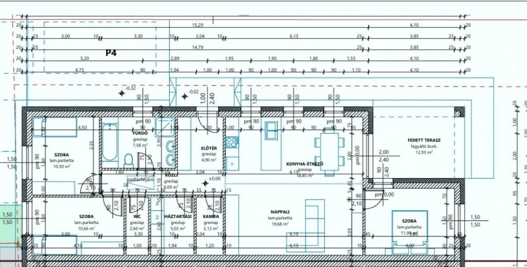 Elosztás: Ideális elrendezésű, 3 hálószobával, amerikai konyhás nappali-étkezővel (18,45 m² + 19,68 m²), fürdőszobával (7,58 m²), külön WC-vel, háztartási helyiséggel és kamrával.