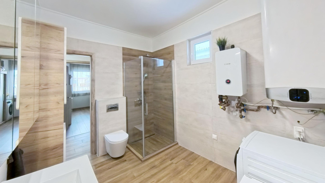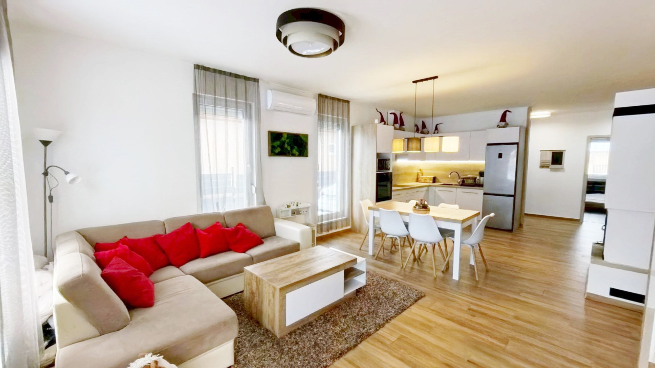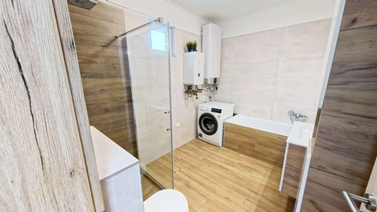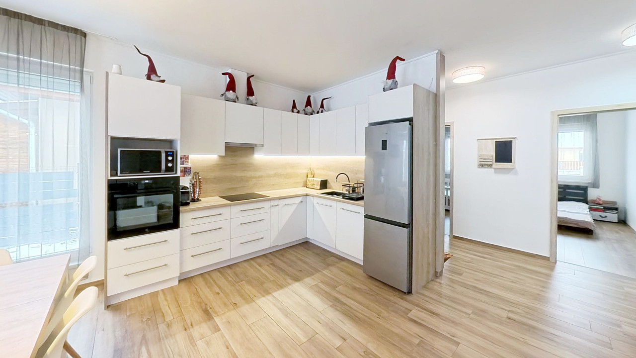 A fürdőszobában kapott helyet a BOSCH ELEKTROMOS KAZÁN és az ARISTON okos villanybojler is. A bejárattól jobbra a konyha-étkezőbe juthatunk, amely egy légtérben van a nappalival. A konyhában EGYEDI TERVEZÉSŰ, IGÉNYESEN BEÉPÍTETT, MODERN KONYHABÚTOR van, melyben minden fontos konyhai gép (Elektrolux sütő és indukciós főzőlap, Bosch mosogatógép, szag elszívó) beépítésre került.