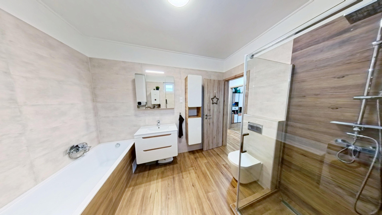 Az Éden lakóparkban található házra jellemző a RENDKÍVÜL VILÁGOS, TÉNYLEG TÁGAS TEREK. Belépve egy kényelmes méretű előtérbe érkezünk. Innen nyílik balra az egyik hálószoba, mellette még kettő. A három hálószoba egyforma méretű. A harmadik szoba mellett a KÜLÖN WC van mosdóval, a szobával szemben a valóban tágas, MODERN FÜRDŐSZOBA, melyben kád és zuhanyzó is rendelkezésre áll.