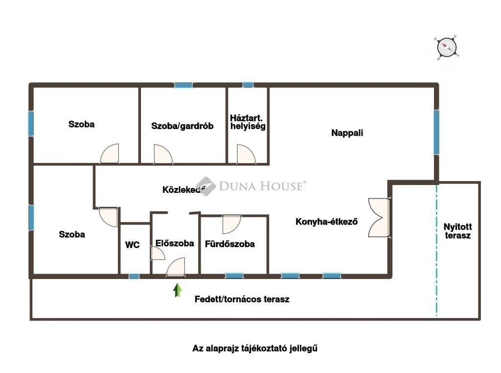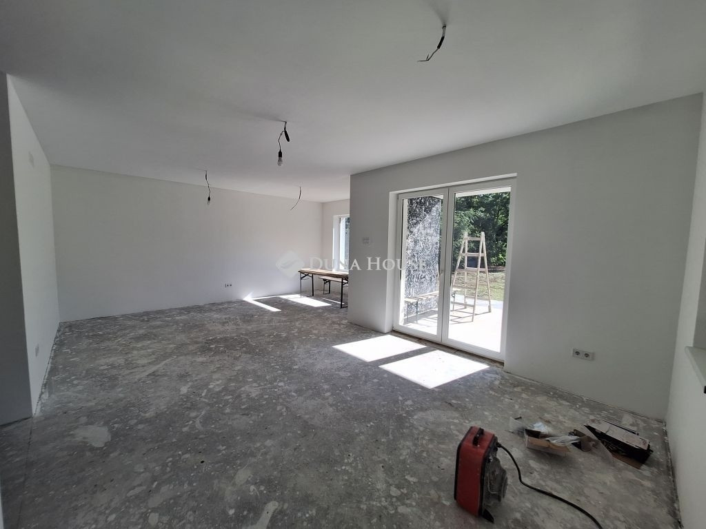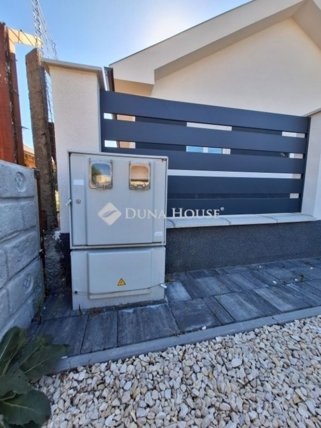A konyha étkezőből teraszajtó vezet a kinti teraszra, melynek egy része fedett. A teraszról a tágas kertre nyílik kilátás. Az ingatlanon garázs, kocsibeálló elhelyezhető.