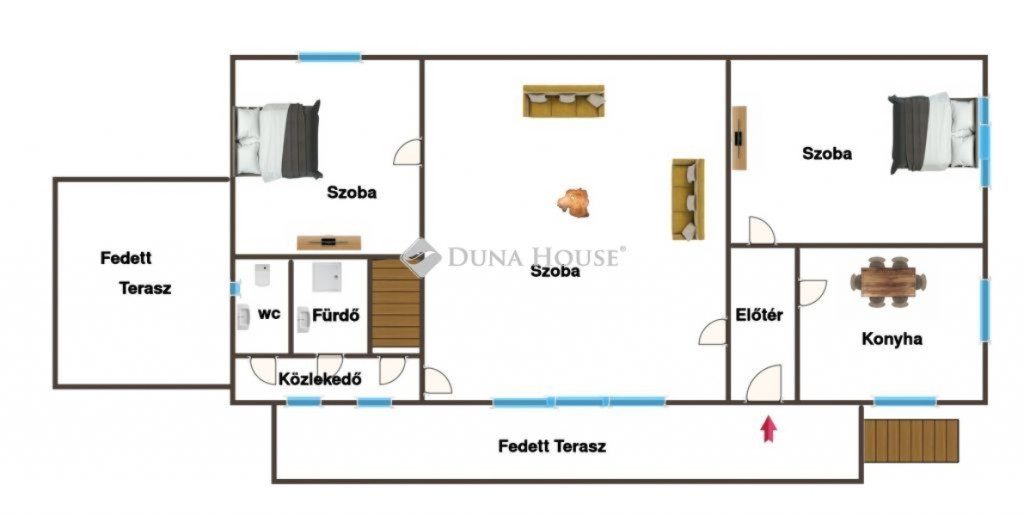 2 terasz (bejárati, déli fekvésű és hátsó terasz)