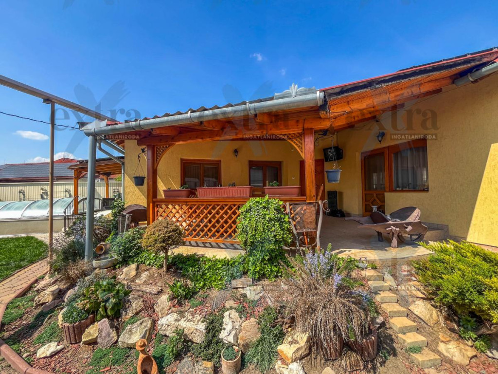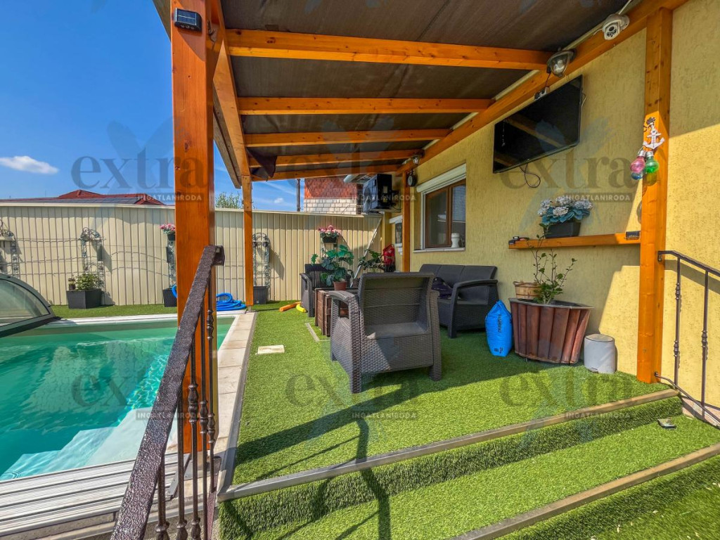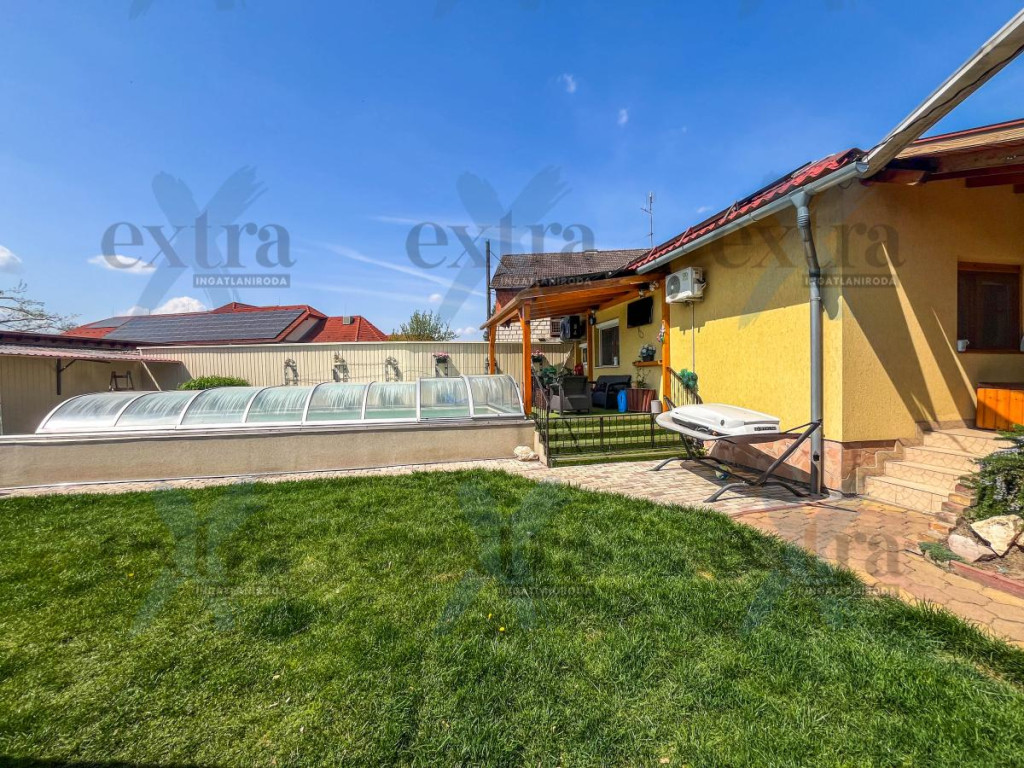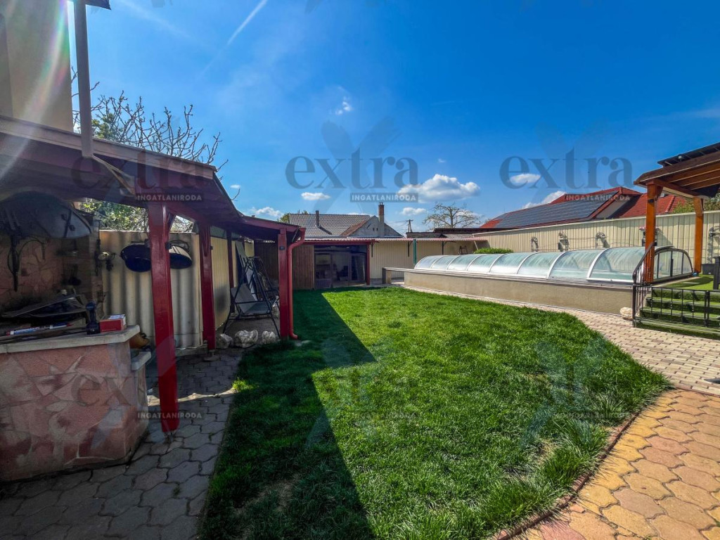 A 600 m²-es telken számos extra szolgálja a kényelmet és a kikapcsolódást. A 15 kW-os napelemrendszer jelentős rezsicsökkentést biztosít. A sósvizű, fűthető medence áramoltatóval tökéletes a nyári pihenéshez, míg a kerti sütögető ideális családi és baráti összejövetelekhez.