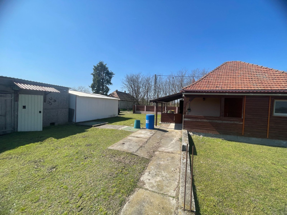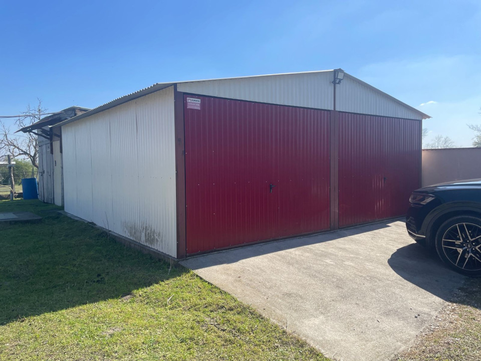 Az udvarban találunk egy 36 m2-s fémlemez szerkezetű kétállásos garázst, mögöttem kisebb gazdasági épülettel.