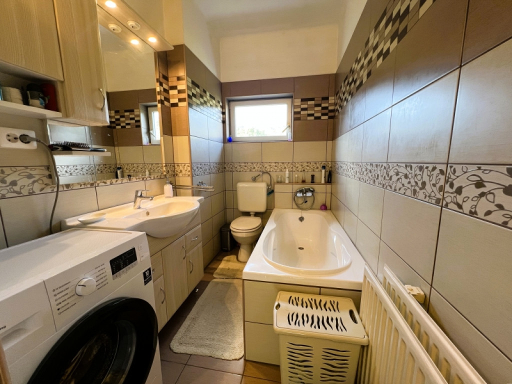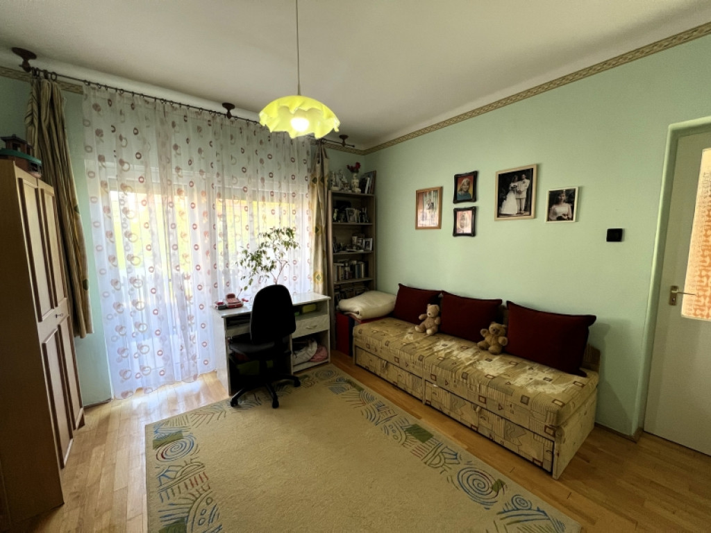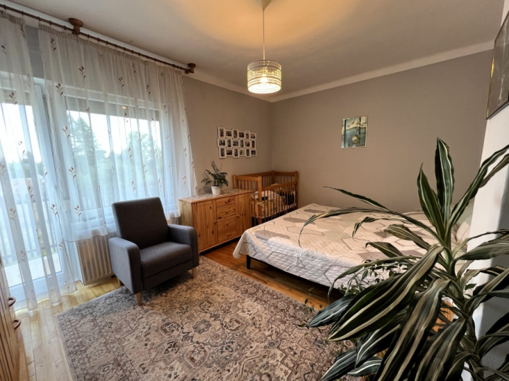 Felső szinten található szintén egy közlekedő, ahonnan nyílik a fürdőszoba zuhanyzóval, káddal és WC-vel, illetve 3 külön nyíló szoba, melyekhez egy 6m2 és egy 11m2-es terasz is tartozik. Az alsó szinten minden helyiségben járólap, a felső szinten a folyosón járólap, a szobákban pedig szép állapotú fa parketta van.