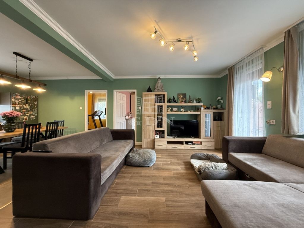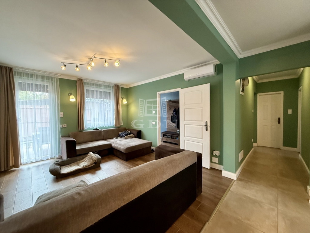 A 35 m²-es garázs két autó kényelmes tárolására alkalmas, a térkövezett kocsibeálló, valamint az öntözőrendszerrel ellátott kert tovább növeli a komfortérzetet.