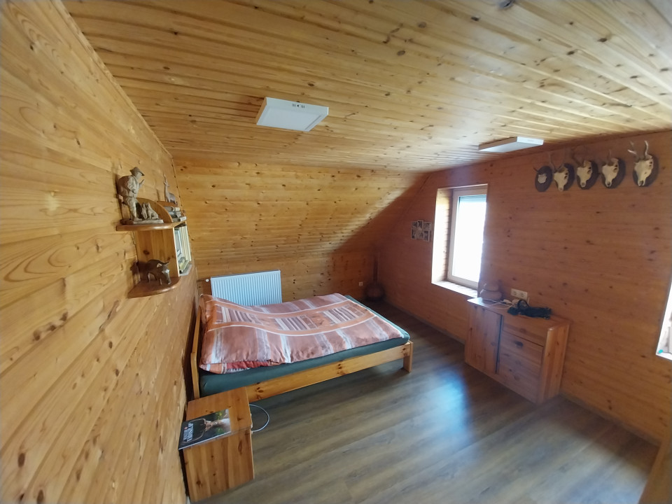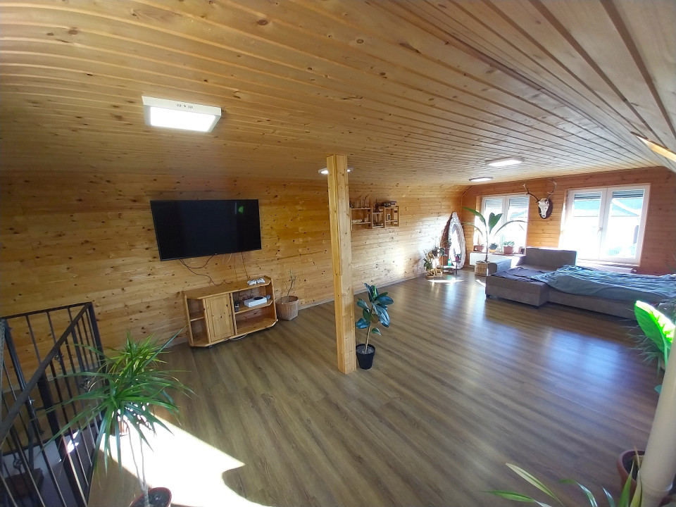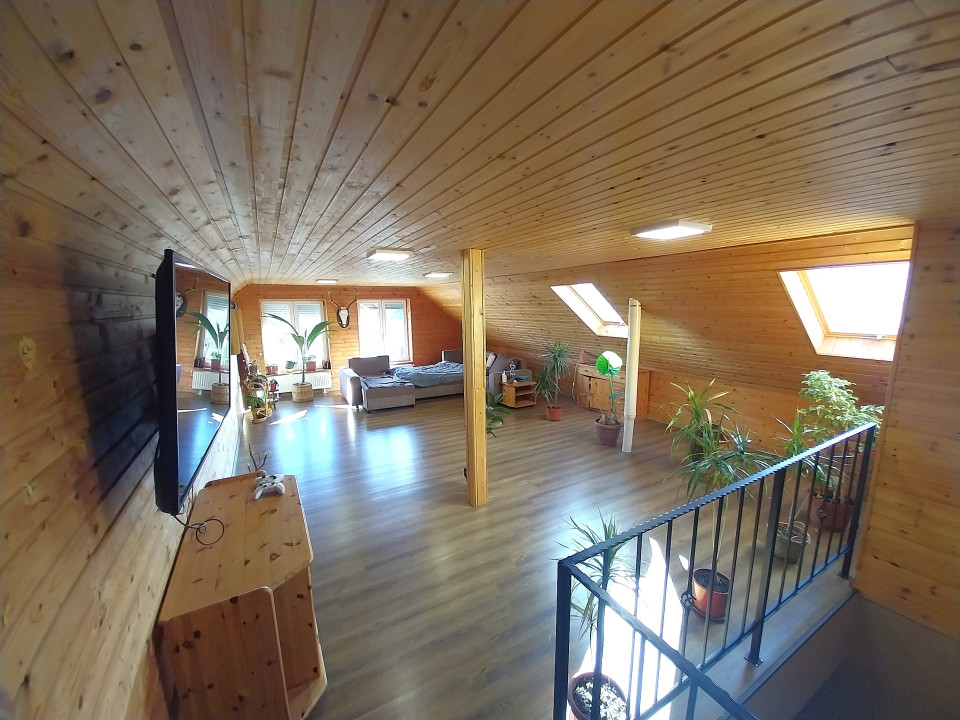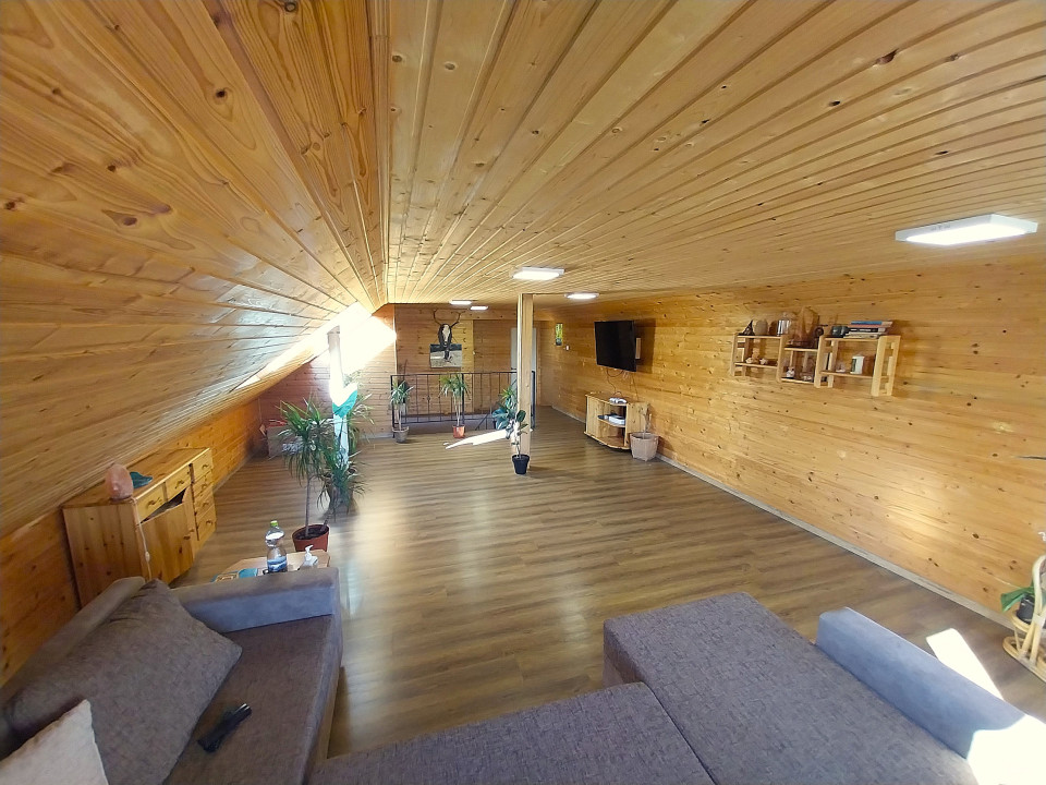 Az emeletre felérve egy impozáns nappali tárul elénk, ahol a teljes szintet meleg hangulatú lambéria burkolat teszi igazán otthonossá. Az emeleten található még egy külön szoba, egy WC kézmosóval, valamint egy padlástér, amely kiválóan alkalmas tárolásra.