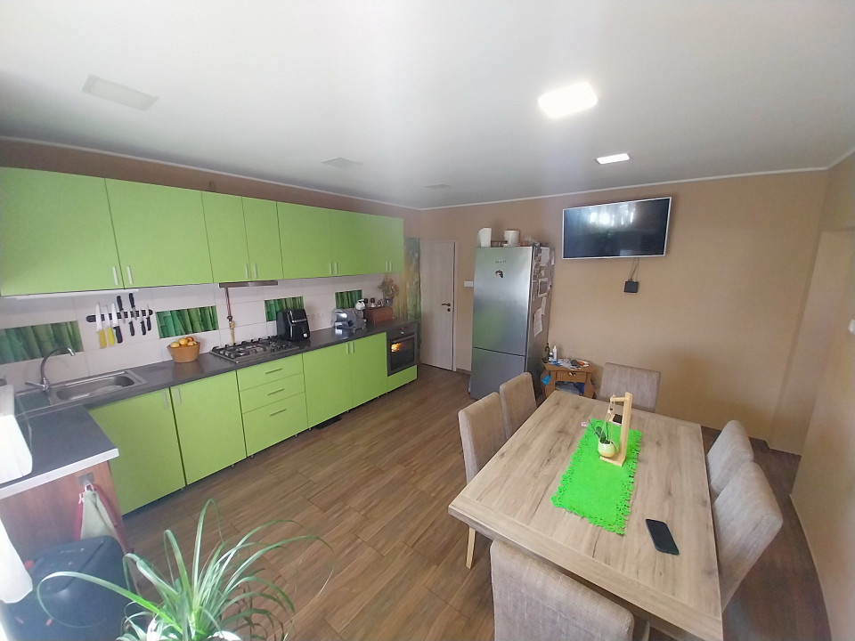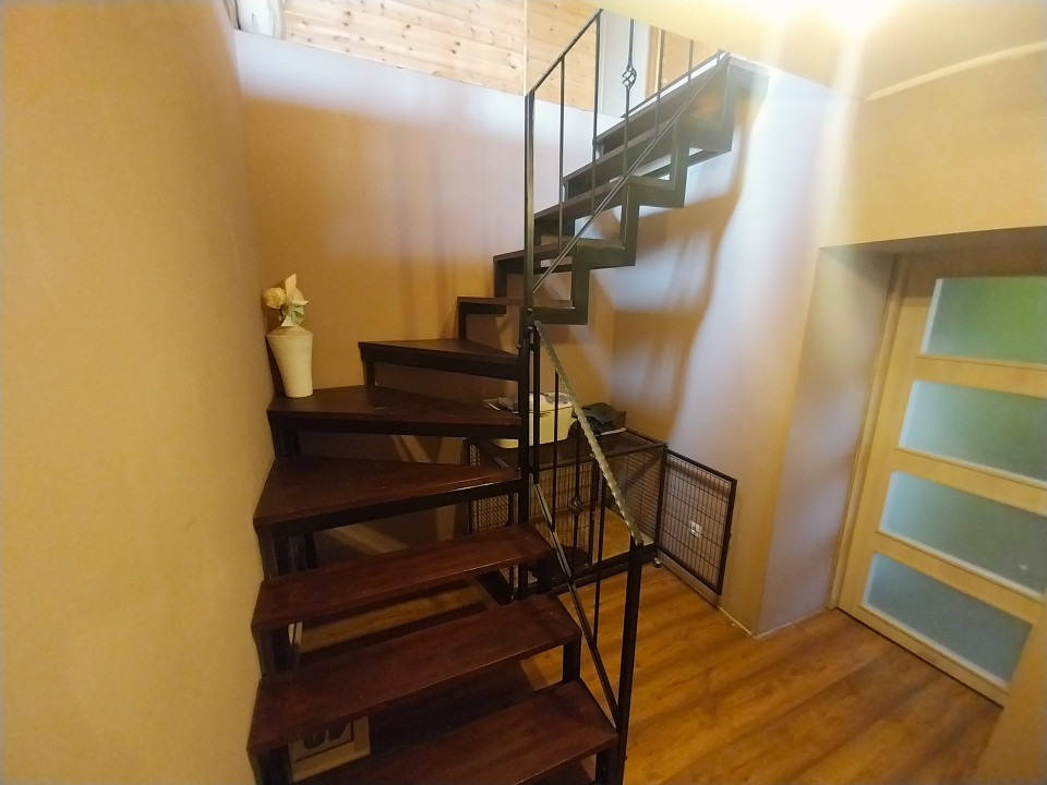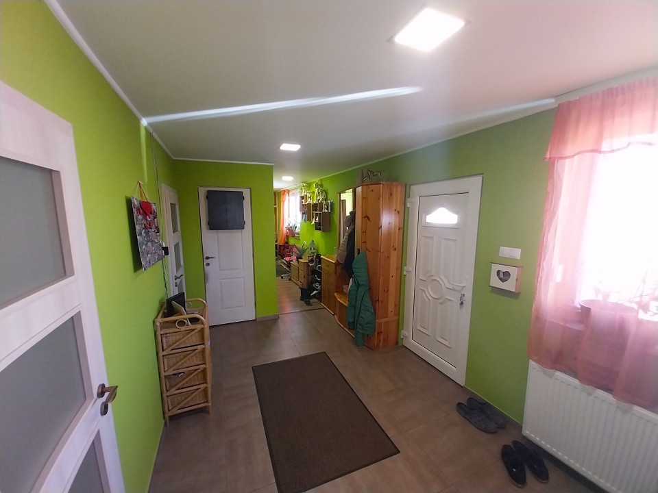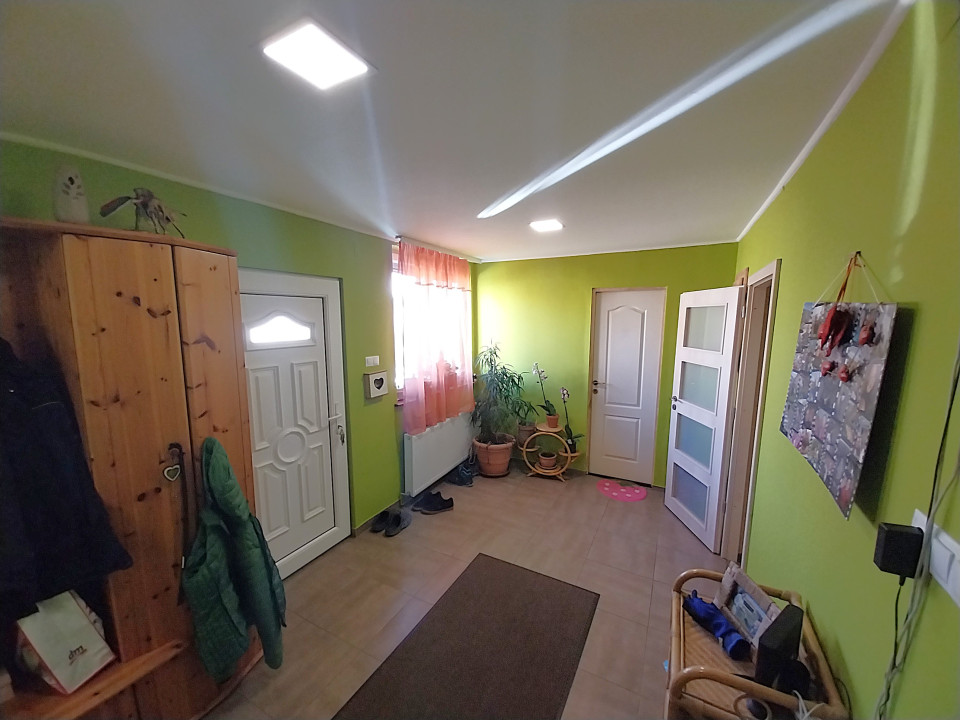 Az előszobán tovább haladva egy praktikus tárolóhelyiséghez érkezünk, majd egy tágas lépcsőházhoz, amely nemcsak az emeletre vezet, hanem további tárolási lehetőséget is kínál. Az előszoba végén egy újabb szoba található, ahonnan közvetlen kijárat nyílik a fedett teraszra, és a hatalmas kerti kemencéhez, ami tökéletes helyszín a baráti összejövetelekhez.