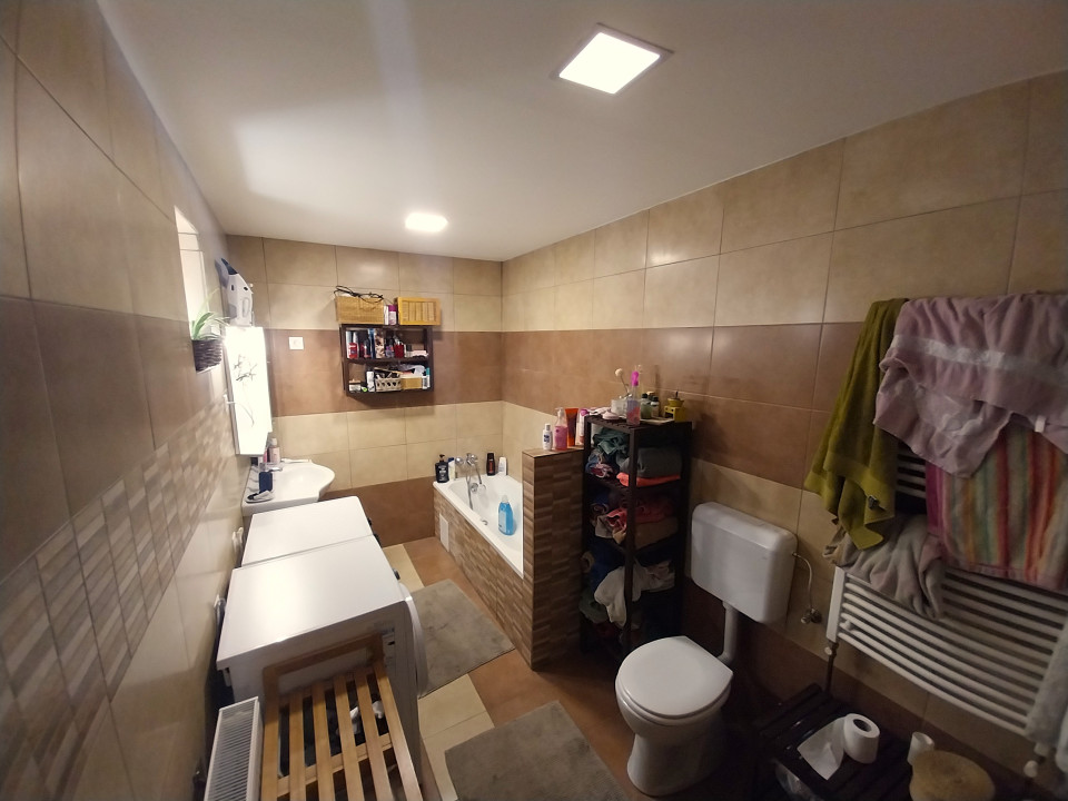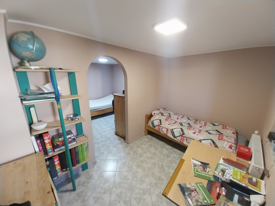 Belépve a házba egy tágas előszoba fogad minket, amely egykor a ház verandája volt. Innen balra egy világos szoba nyílik, ideális hálószobának vagy dolgozószobának. Szinte a bejárattal szemben találjuk a nagy méretű konyha–étkezőt, beépített bútorzattal, ahol a közös főzések és családi étkezések igazi élménnyé válnak. A konyhából nyílik a kádas fürdőszoba WC-vel, ahol a modern, energiatakarékos kondenzációs gázkazán biztosítja a fűtést radiátoros hőleadással.