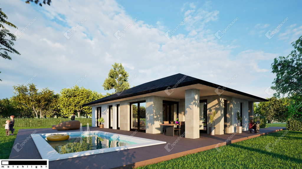 Az ingatlanról: Az ingatlan minőségi alapanyagok felhasználásával és a modern technológia alkalmazásával készül, a lehető legmagasabb színvonalon, minimás stílusban. A nettó alapterület 105m2, ami magába foglal egy hatalmas amerikai konyhás nappalit, 4 hálószobát, 2 fürdőszobát WC-vel, egy kamrát és egy háztartási helyiséget. Továbbá az ingatlanhoz tartozik 2 db térkövezett kocsibeálló, egy nagy méretű 20m2-es épített terasz, melyből 10m2 fedett, továbbá az ingatlanhoz tartozik egy saját használatú 915m2-es kertrész is. Az ingatlanok a látványtervel megegyezően leszknek kialakítva, a medence opcionális tételként, felár ellenében érhető el.