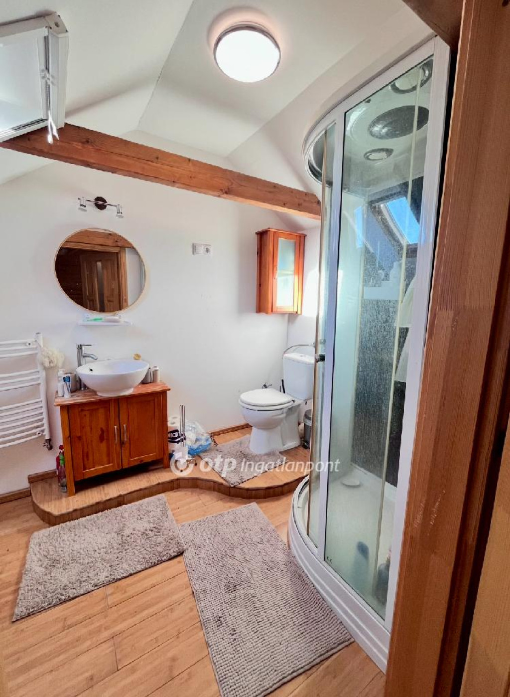 A ház alacsony fenntartási költségű: napelemrendszer, pellet kazán, 2 db hűtő-fűtő klíma és villanybojler gondoskodik az energiatakarékos működésről. A földszinten nappali?étkező, konyha spejzzel, 2 külön nyíló hálószoba saját gardróbbal, fürdőszoba, külön WC és háztartási helyiség található. A tetőtérben további 2 szoba, előtér, tároló és egy második fürdőszoba került kialakításra.