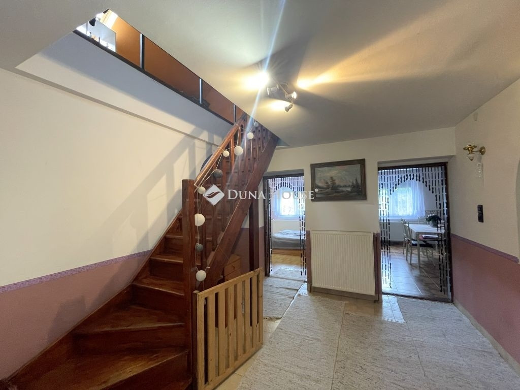 Izsák csendes utcájában, rendezett környezetben 974 nm-es, összközműves, rendezett telken tetőbeépítéses, teljesen alápincézett jó állapotú családi ház eladó, akár további lakrész kialakítására is alkalmas 72 nm-es melléképülettel.