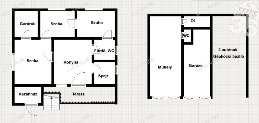 A házhoz tartozik kettő garázs és egy dupla gépkocsi beálló, valamint ól és egy kültéri WC.