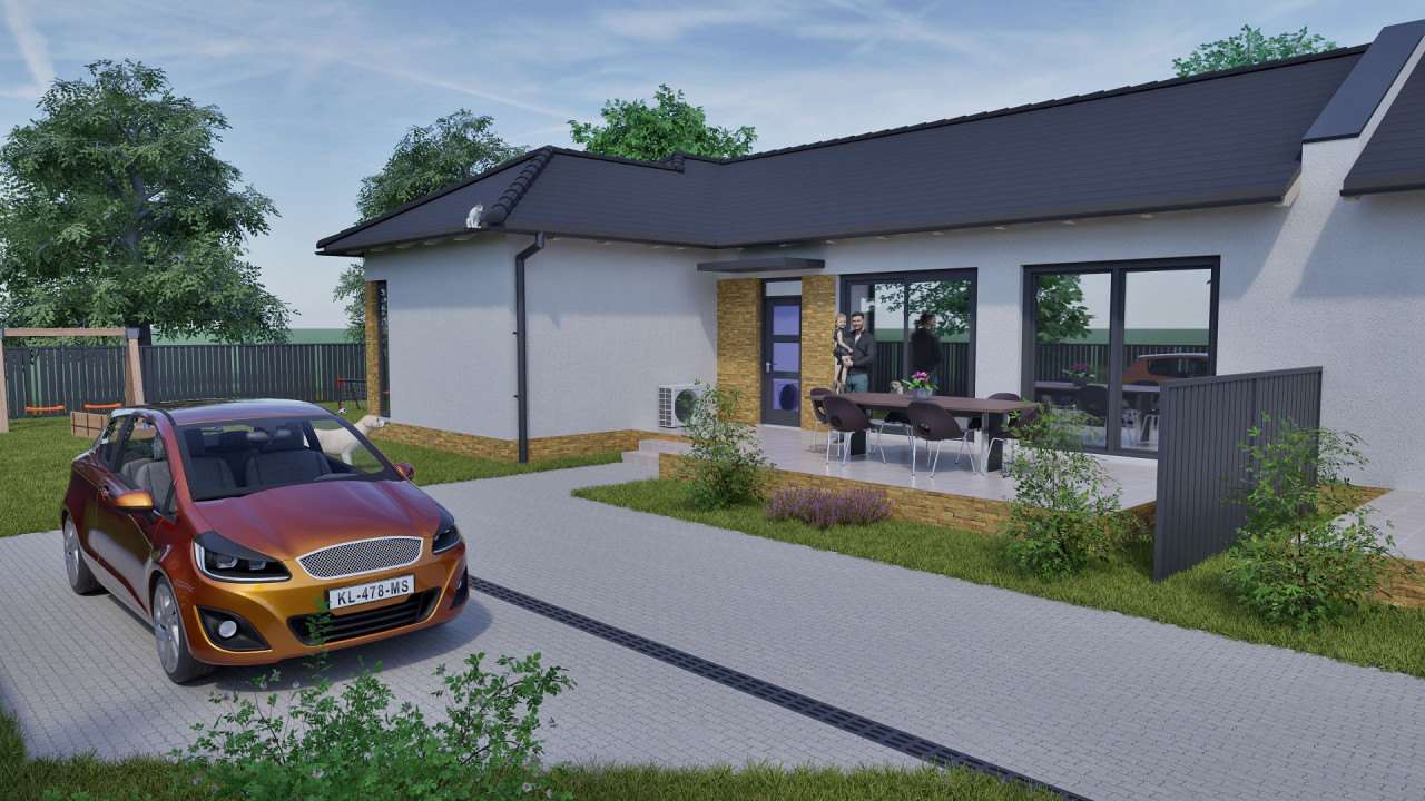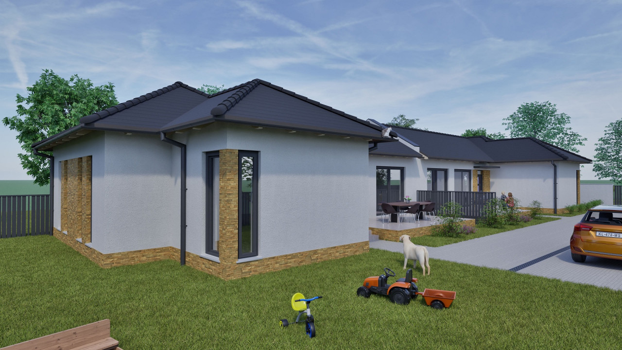 A 754 m2-es telken megosztott kettő 93 m2-es ház épül. A ingatlan előtt egy- egy kocsi parkolási lehetőséggel.