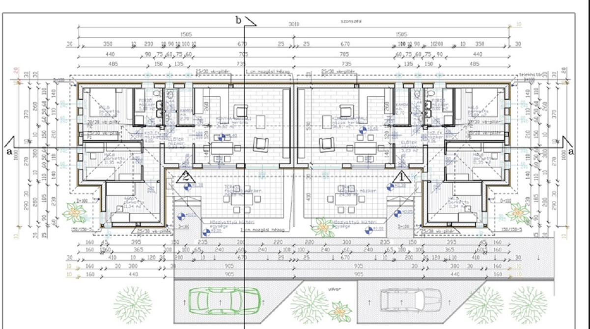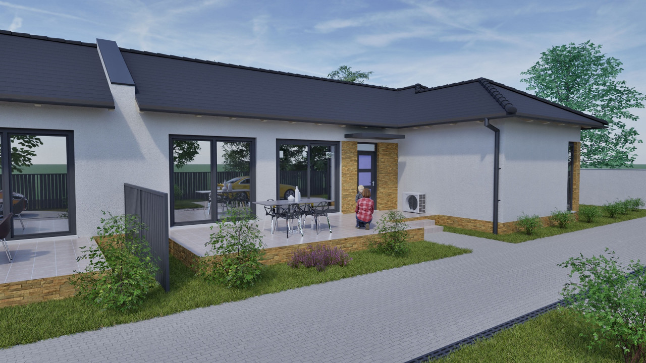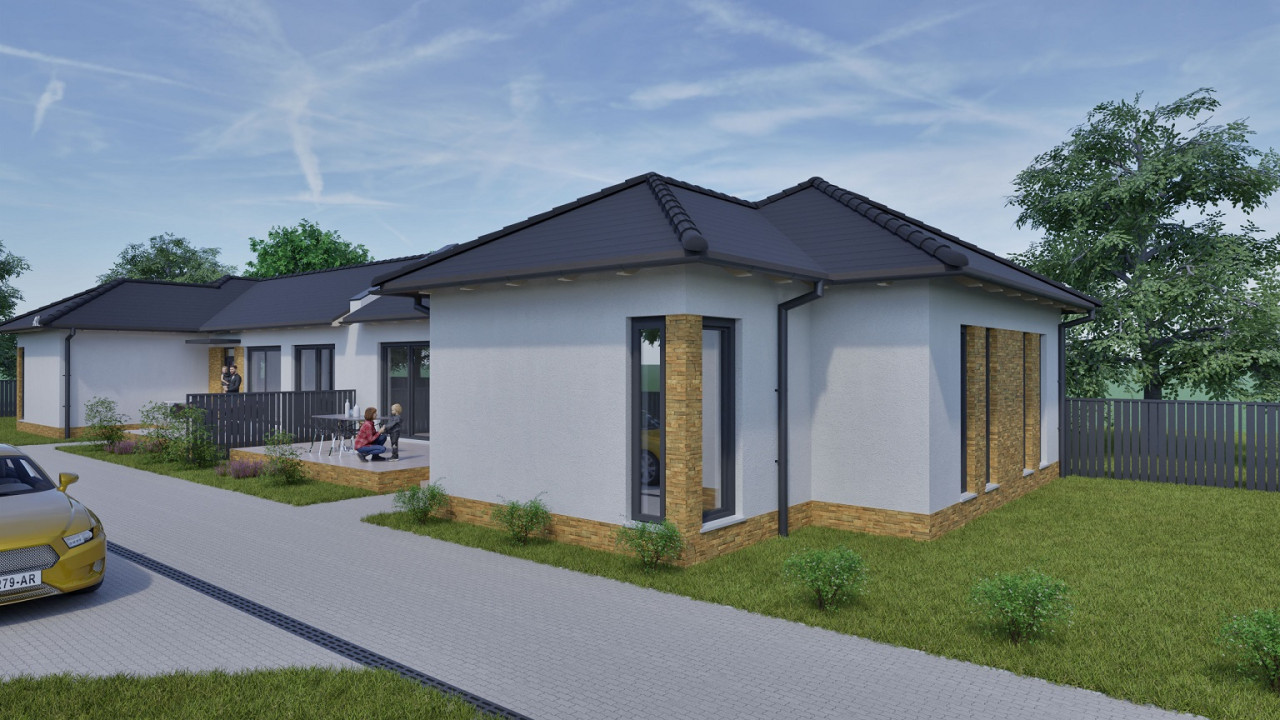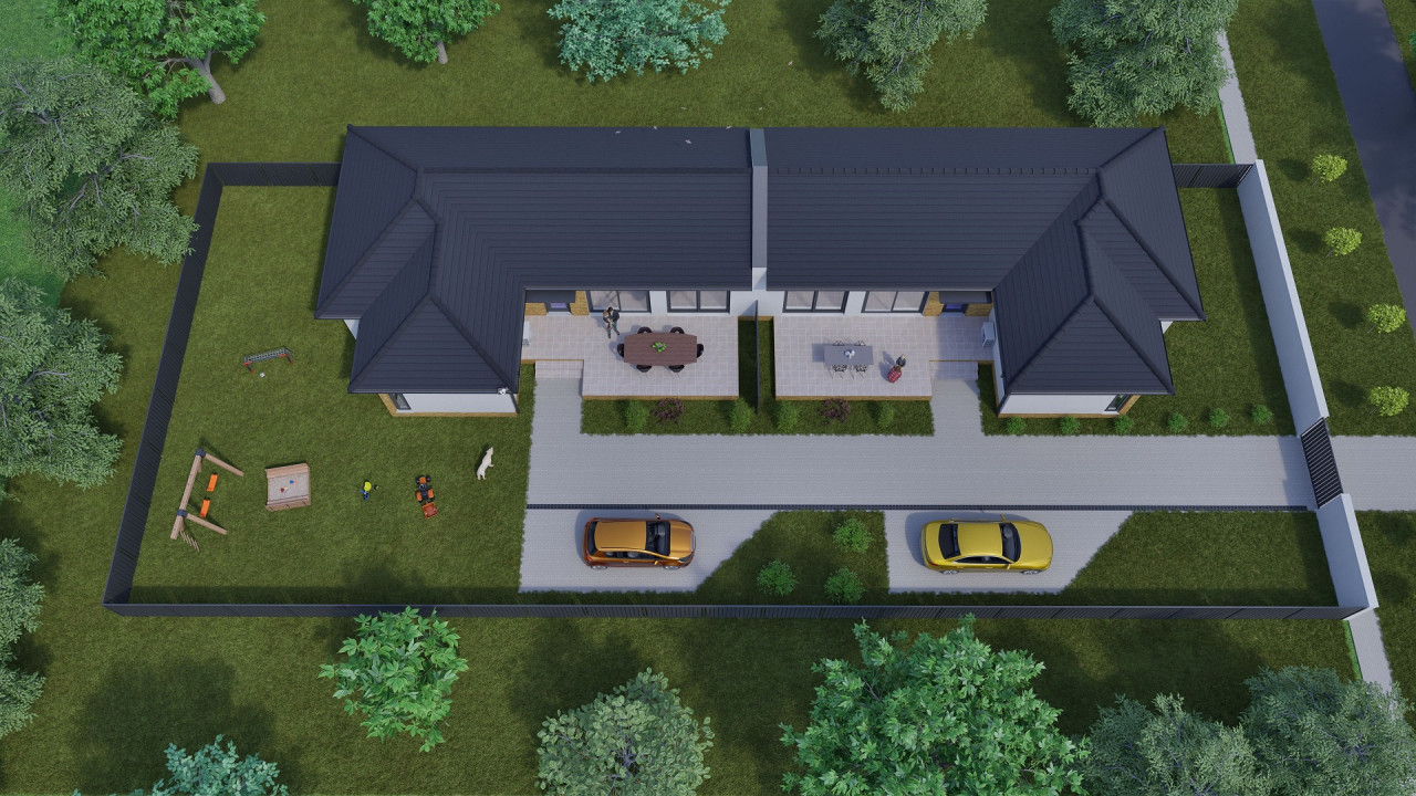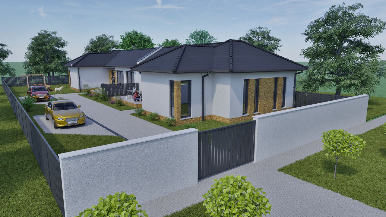 A 754 m2-es telken megosztott kettő 93 m2-es ház épül. A ingatlan előtt egy- egy kocsi parkolási lehetőséggel.
