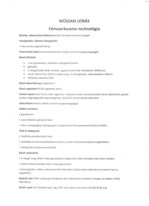 A tartószerkezet 15 cm-es tüzihorganyzott acélszerkezet, közte 15 cm hőszigetelés + a homlokzaton 20 cm hőszigetelés, belül két réteg gipszkarton, a tetőfedés korcolt lemezfedés, a homlokzati nyílászárók háromrétegű üvegezésű műanyagok, a padlófűtés Gree típusú hőszivattyúval. Bővebb leírás a mellékelt műszaki leírásban.
