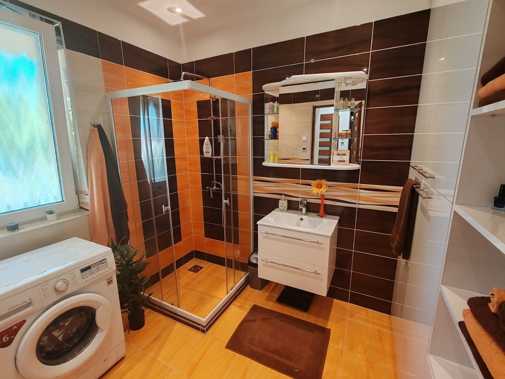 4 éve épült TEHERMENTES, MAGAS MŰSZAKI ÉS KOMFORT FOKOZATTAL RENDELKEZŐ földszint + szuterén szintes családi házat kínálunk megvételre a Fejér megyei Kápolnásnyéken. Az ingatlan téglaépítésű, homlokzati szigetelése 15 cm-es. Fafödémes, 20 cm-es födémszigeteléssel borítva, betoncserép héjazattal. Nyílászárói 3 rétegű biztonsági üvegezésű műanyag ablakok, szúnyoghálókkal, elektromos redőnyökkel felszerelve. Fűtéséről a lakótér központjában elhelyezett 12 kw-os látványkandalló (eredeti csiszolt kövekkel), helyiségenként szabályozható radiátorok, padlófűtés és 3 db 3.5 kw-os hűtő-fűtő klíma gondoskodik. Az ingatlanba gáz nincs bevezetve, így kizárólag elektromos, energiatakarékos ellátottságú. Csatorna nincs, így a szennyvíz egyedi biológiai szennyvíztisztító tartályba vezetődik.