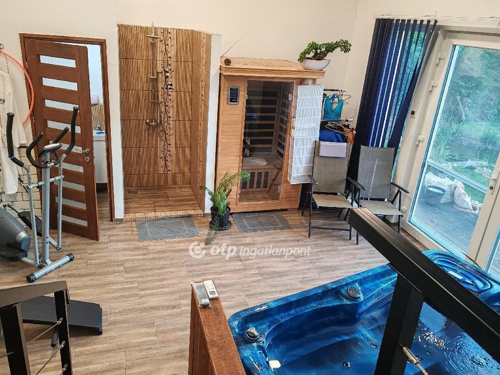 A telken külön wellness épület található jakuzzival, infraszaunával, esőztetős zuhanyzóval és pihenőtérrel, közvetlen napozóterasszal. A kertben kerti tó, patak, kiülő és sütögető kapott helyet, fúrt kúttal kiegészítve.