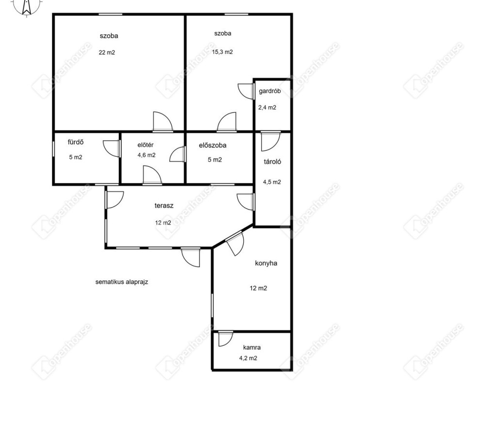 Helyiségek: két szoba, konyha, fürdőszoba, előszoba, előtér, kamra, tároló, terasz