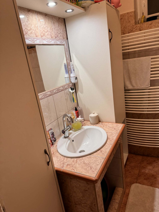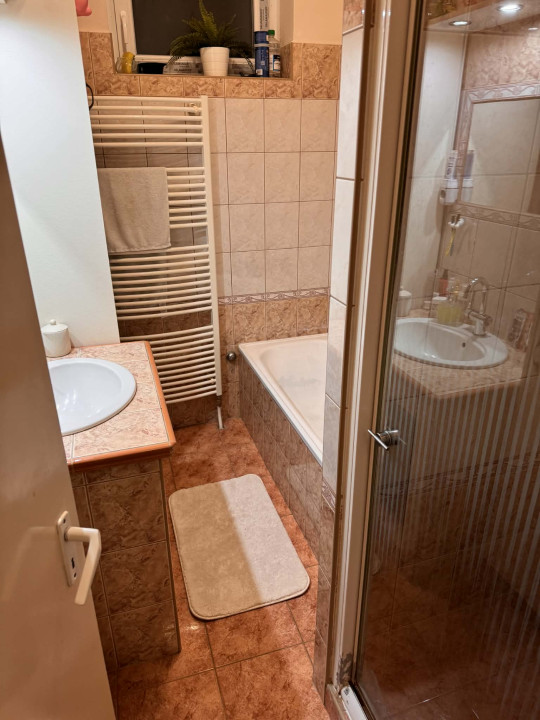A folyosó végén található a fürdőszoba épített zuhanyzóval, fürdőkáddal, épített mosdóval, ha szükséges, az ide készült bútor is megegyezés tárgya lehet.