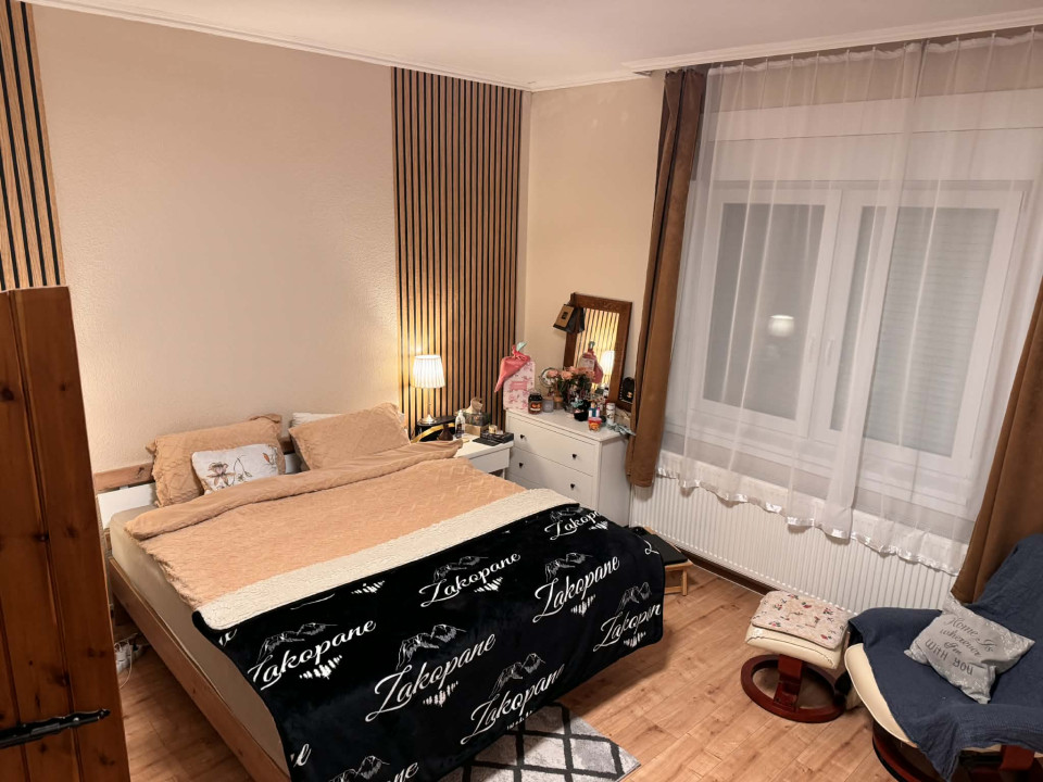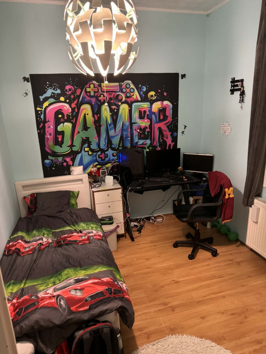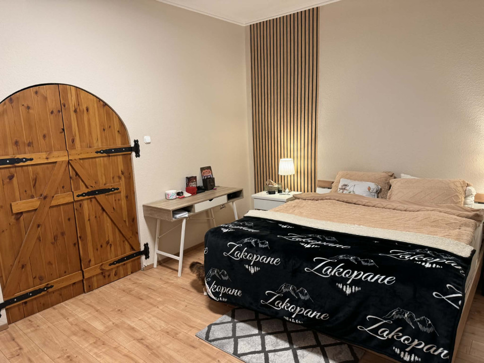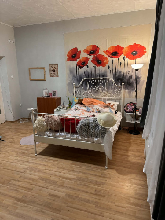 Vele szemben egy boltíves-egyedi fa ajtós, 20,5nm-es szoba található új, jó minőségű laminált padlóval.