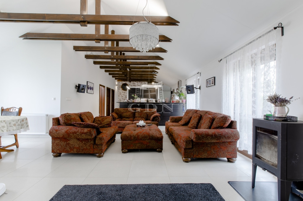 Belsőterek rendkívül ötletesen és ízlésesen vannak berendezve, gépesített IKEA konyhabútor, számos beépített gardrób, illetve cipősszekrény, gépesített mosókonyha áll rendelkezésünkre. Kikapcsolódásért nappaliban házimozi rendszer, az udvaron pedig fedett kerti konyha (épített grill, kemence, bográcsozó) és wellness (szauna, hatalmas jakuzzi) részleg áll rendelkezésünkre.