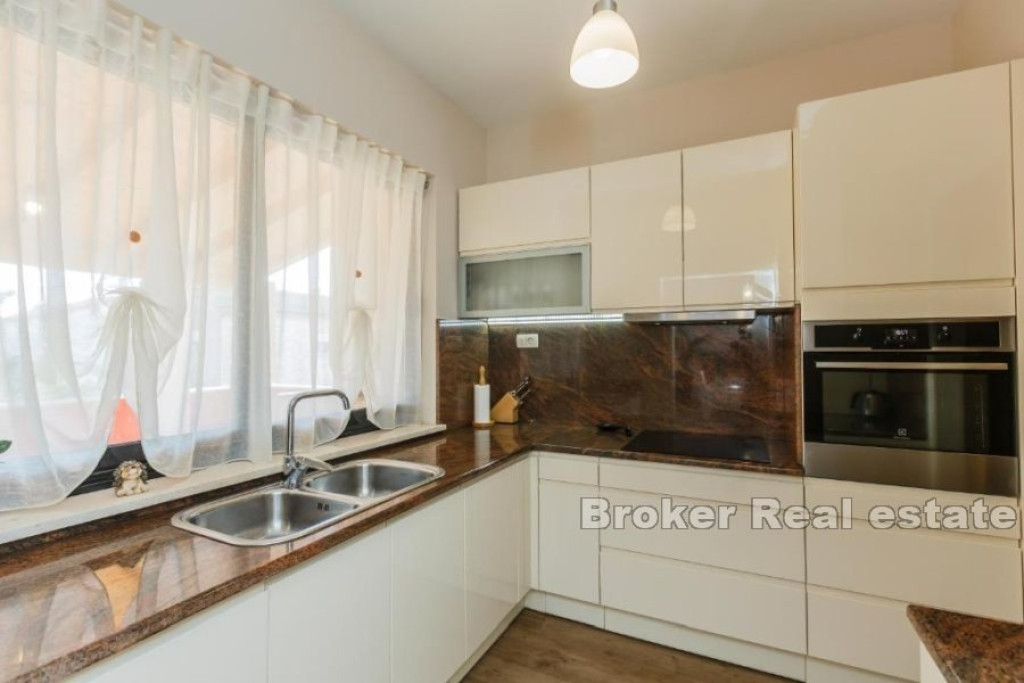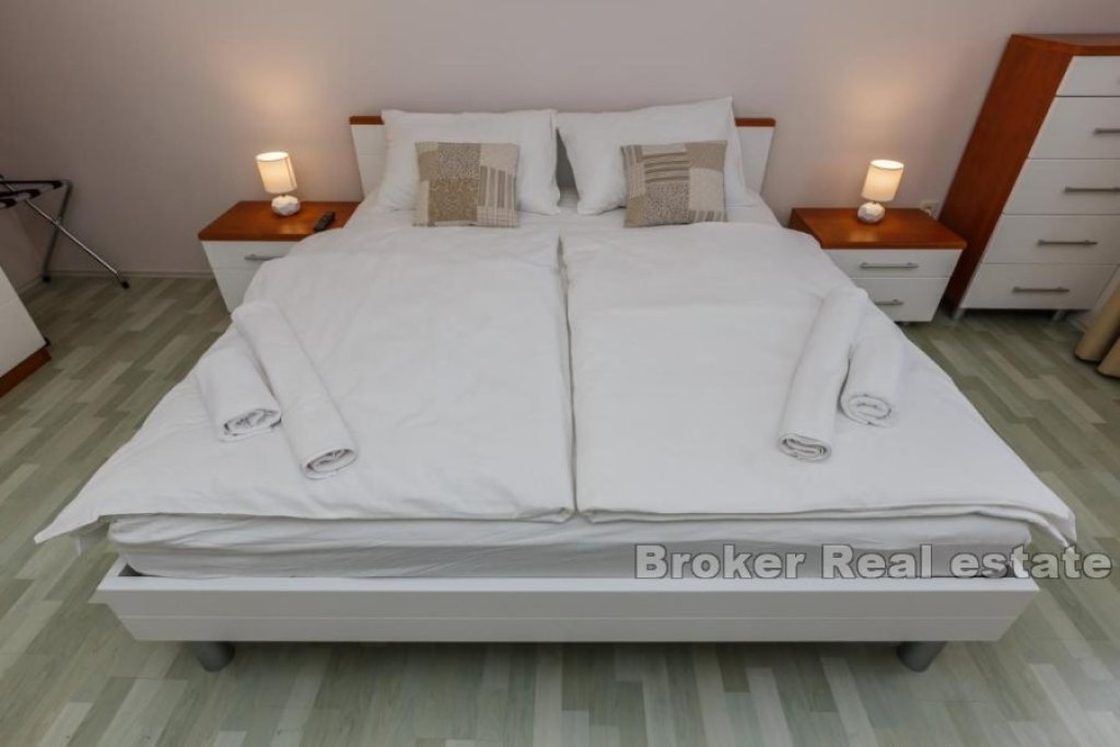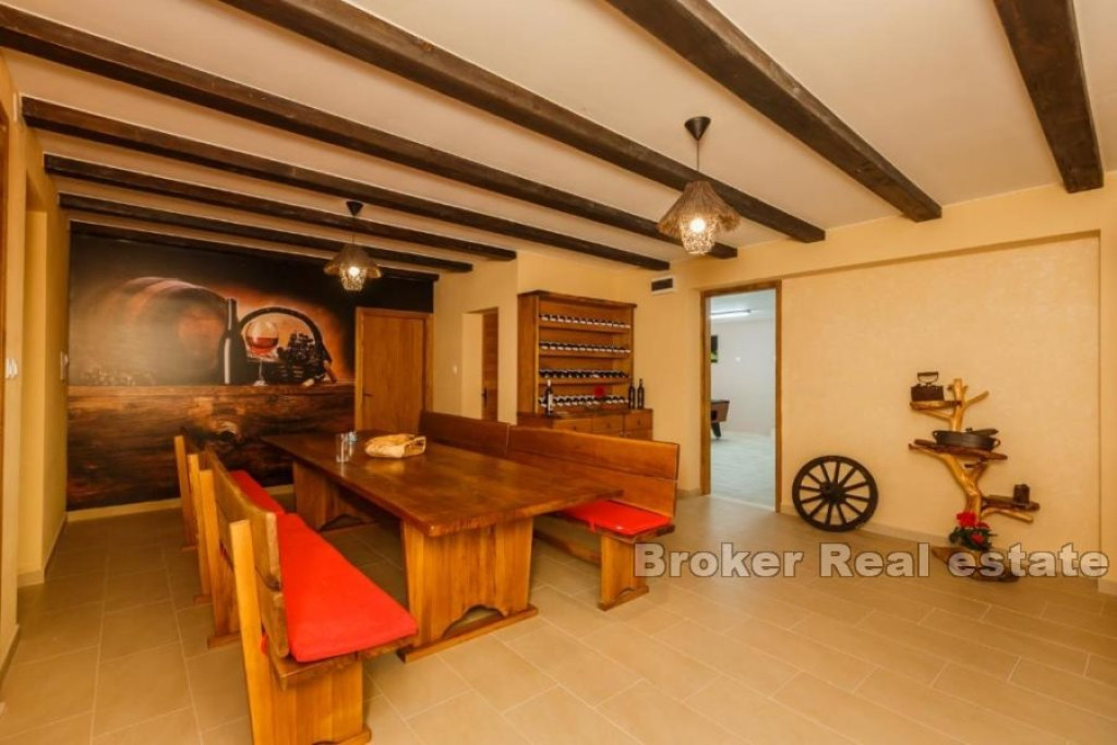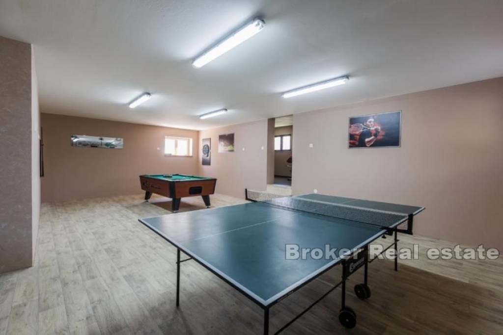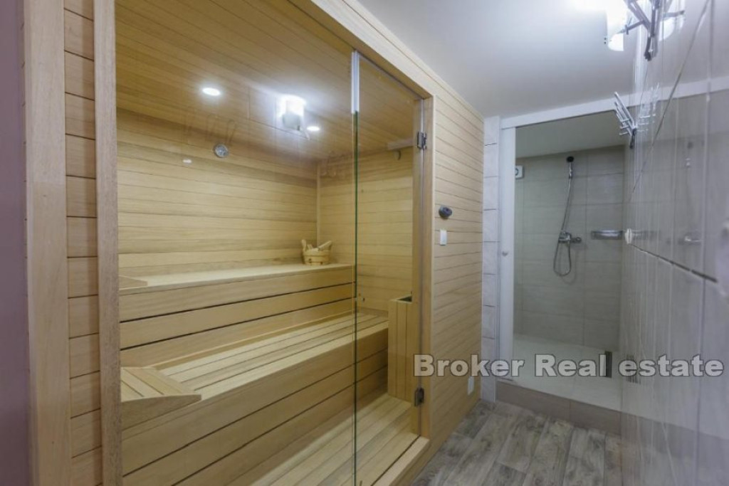 A house for sale in Kaštela with a living area of ​​420 m2, located on a plot of land of 712 m2. The house is located in a beautiful location overlooking the sea, only 150 m from the beautiful beach. The house is equipped with all amenities for a comfortable life and vacation, such as a swimming pool, sauna, gym, and children’s playroom. The house consists of 3 floors and a basement where there is a sauna, a bathroom, a children’s playroom, a tavern and a wine cellar. On the ground floor there is a kitchen with a dining room, a living room, 2 bedrooms, with bathrooms and a storage room. The ground floor has a separate exit to the terrace of 45 m2. The floor on the first floor is a separate apartment in which there is a kitchen with a dining room, a living room, a terrace, 1 room, a bathroom and a separate toilet. The second floor consists of 4 bedrooms, 3 bathrooms and a large playroom with access to the terrace. The house is sold fully furnished. The proximity of the beautiful beach and all essential facilities for life, such as restaurants, shops, cafe bars, make this house ideal for living as well as for renting for tourist purposes. BROKER REFERENCE ID:2033/09