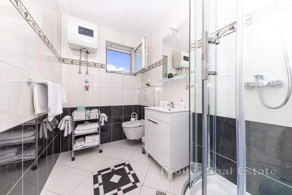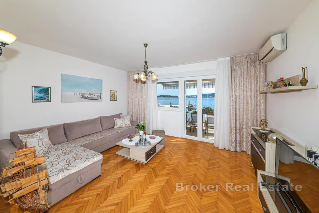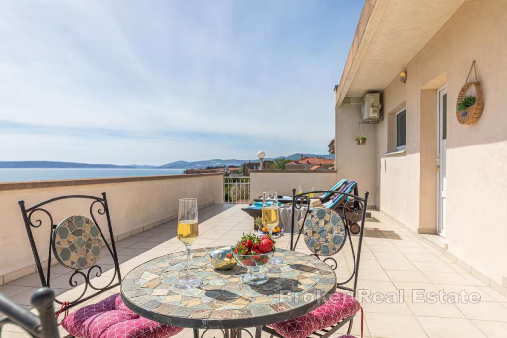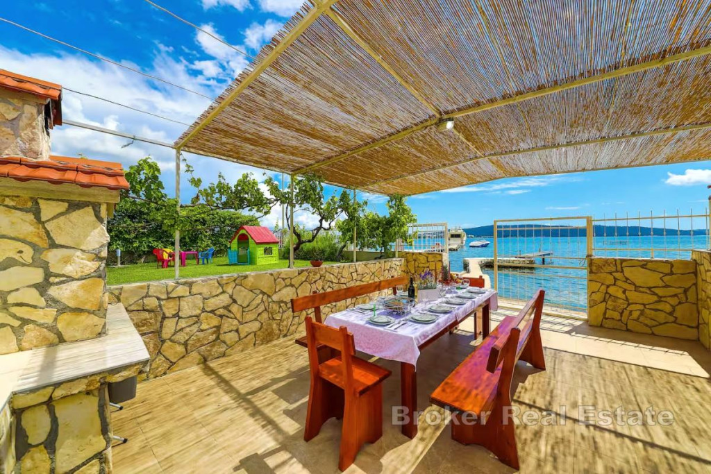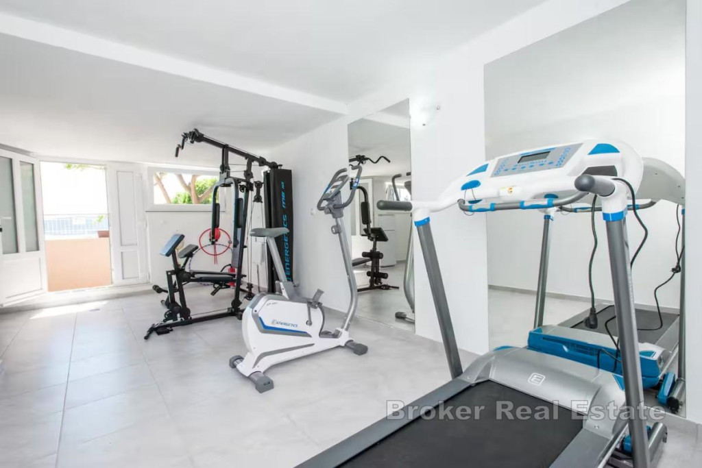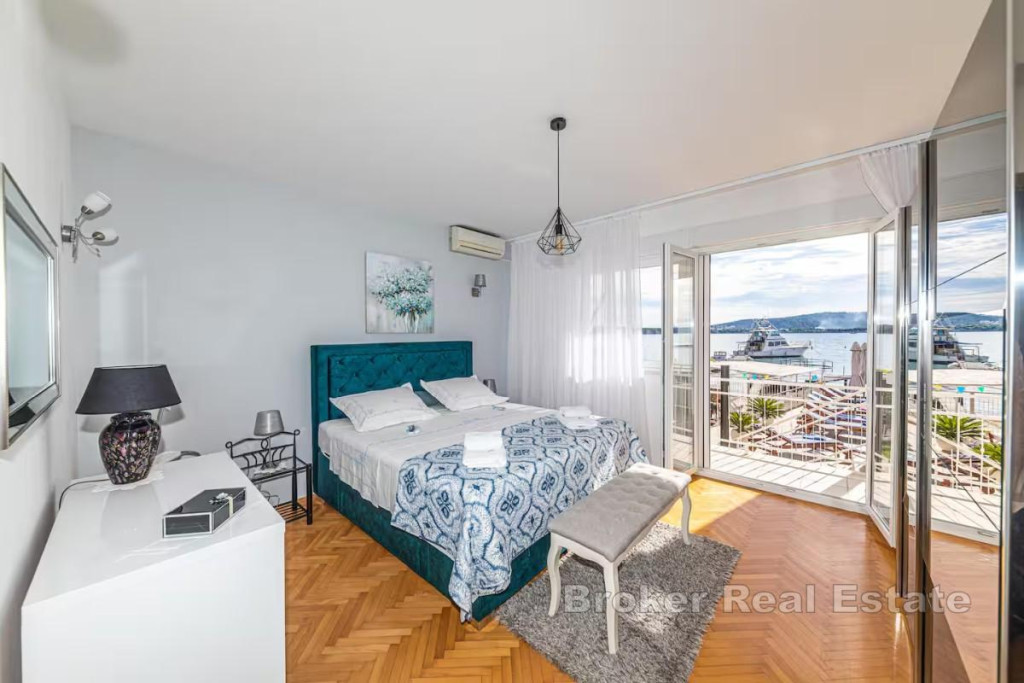 Located in the first row to the sea, this imposing, luxurious and extremely spacious villa represents a perfect combination of elegance, functionality and a superb location. The villa is spread over a large plot of 740 m², while the total living area is as much as 485 m², distributed over three floors and a basement, providing plenty of space, comfort and privacy. At first glance, this attractive Mediterranean property leaves a strong impression thanks to its exceptional position by the sea itself, open view and carefully thought-out layout of the rooms that allows maximum enjoyment of natural light and a panoramic view of the crystal clear sea. A fully equipped gym is located in the spacious and functional basement, ideal for daily recreation and an active lifestyle. There is also a garage space here, which is currently adapted into a practical and spacious laundry area, but if necessary it can be easily returned to its original purpose. The ground floor exudes warmth, comfort and a modern style of living. In the center of this floor is a spacious, bright kitchen with dining room, which is harmoniously connected to a large and cozy living room, creating a perfect space for family gatherings and relaxation. On the same floor there are three comfortable, bright bedrooms, which open onto a spacious terrace and a landscaped yard, which naturally continues the interior space to the outdoor environment. In addition to the rooms, there are two modern bathrooms. The exterior of the villa is a true Mediterranean paradise for enjoyment. In the beautifully landscaped yard there are: an attractive swimming pool for refreshment during warm summer days, a children’s playroom ideal for the youngest family members, a barbecue area perfect for socializing and evening parties, a luxurious jacuzzi for complete relaxation and enjoyment. Everything is surrounded by a neat, carefully maintained yard that provides a sense of privacy and peace. On the second floor there is a spacious apartment in the unfinished phase, which provides the new owners with an excellent opportunity to personalize the space according to their own wishes and needs. This floor can be arranged as an independent residential unit, a luxury apartment or an additional family space. On the top floor there are two elegant rooms with private bathrooms, in which the kitchen installation is already prepared. Thanks to this, the space can easily be converted into two separate, fully functional studio apartments, which makes this property extremely attractive for tourist rental or investment. The spacious terrace offers a spectacular, open and unobstructed view of the sea, which creates a unique feeling of freedom and luxury and provides unforgettable sunset scenes. The villa is additionally equipped with numerous amenities that ensure maximum comfort and convenience, including: air conditioning in all key rooms, a private boat mooring, which is a rare and extremely valuable advantage for sea and nautical lovers, five outdoor parking spaces, one parking space in the garage. This extraordinary, luxurious villa in a unique location by the sea represents the perfect combination of a prestigious position, large living space and numerous usage options. It is ideal as an exclusive family residence, but also as a top investment for tourist rentals thanks to its location, layout and potential. BROKER REFERENCE ID:2031/237