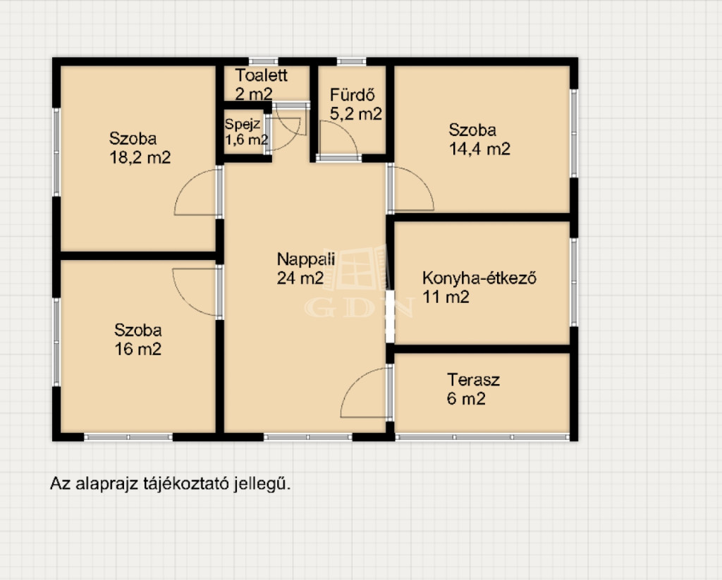 A benapozott otthon 94 m2 - en (+ 6 m2 terasz) tágas terek formájában ad otthont 3 különnyíló szobának, egy tágas konyha - étkezőnek, egy nappalinak, egy spejznek, egy külön helyiségben található toalettnek, valamint egy fürdőkáddal felszerelt fürdőnek.