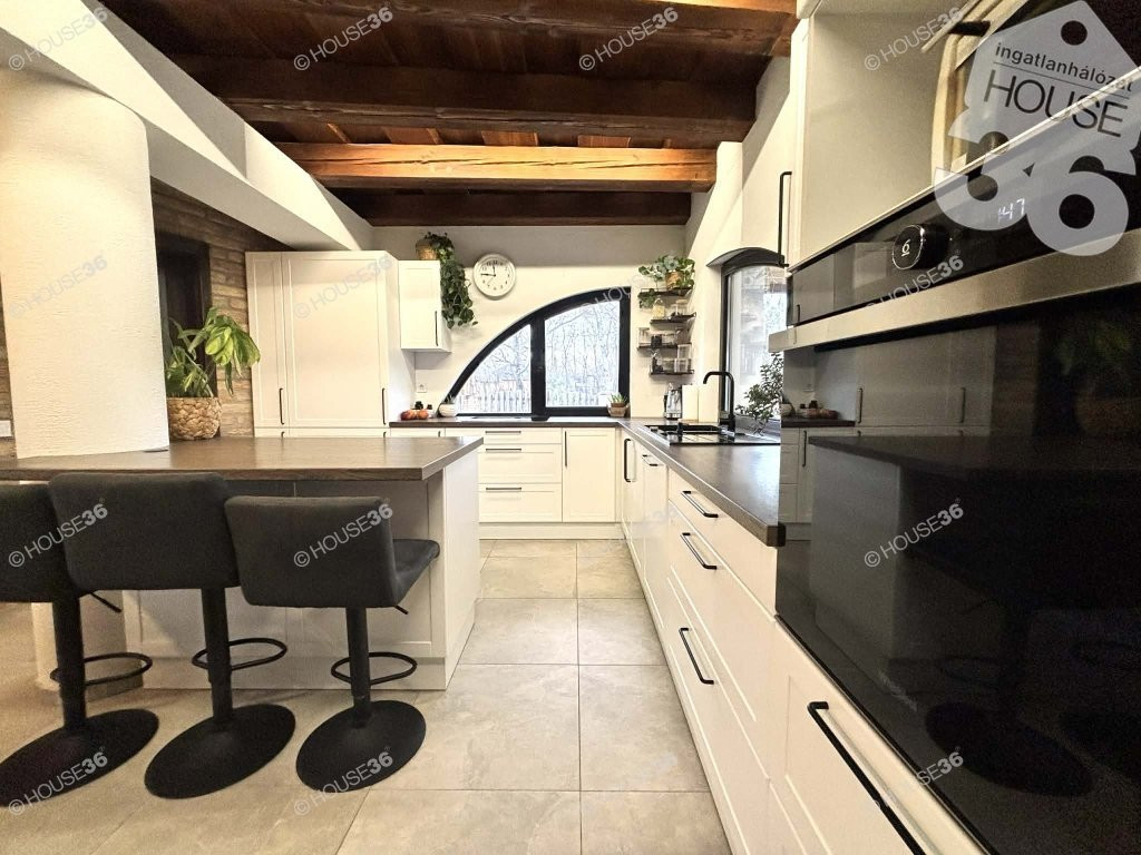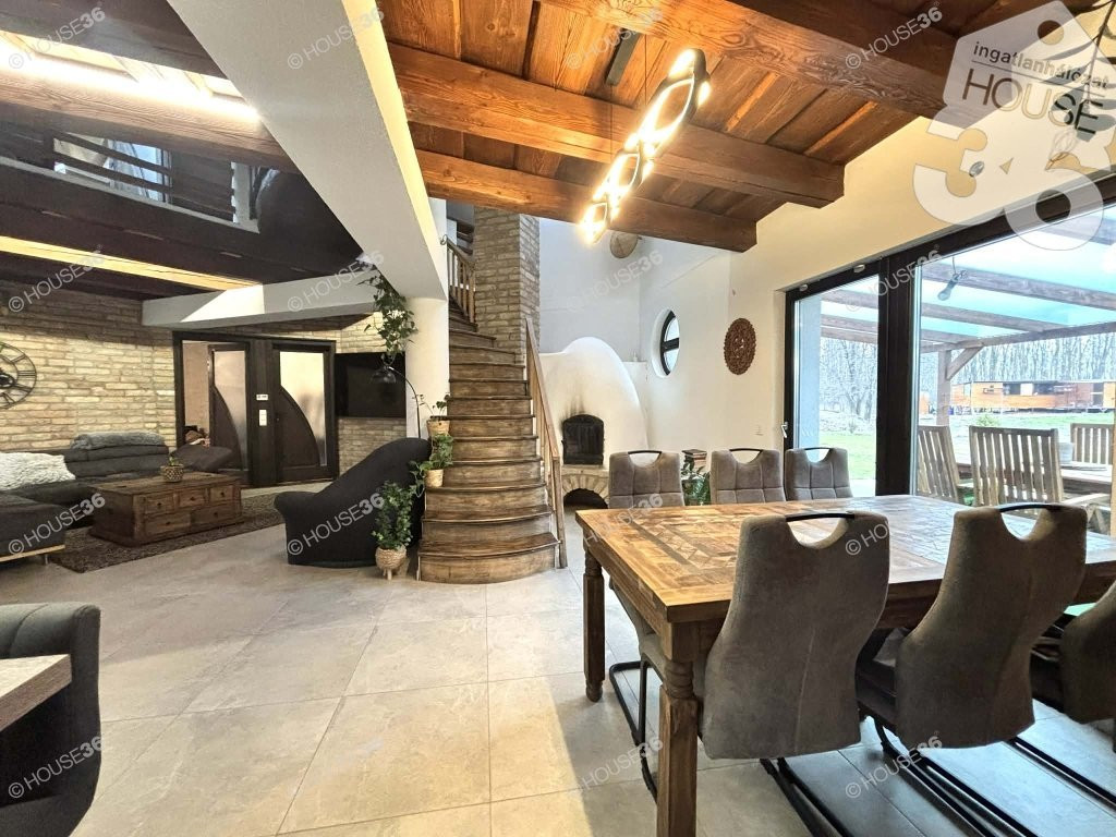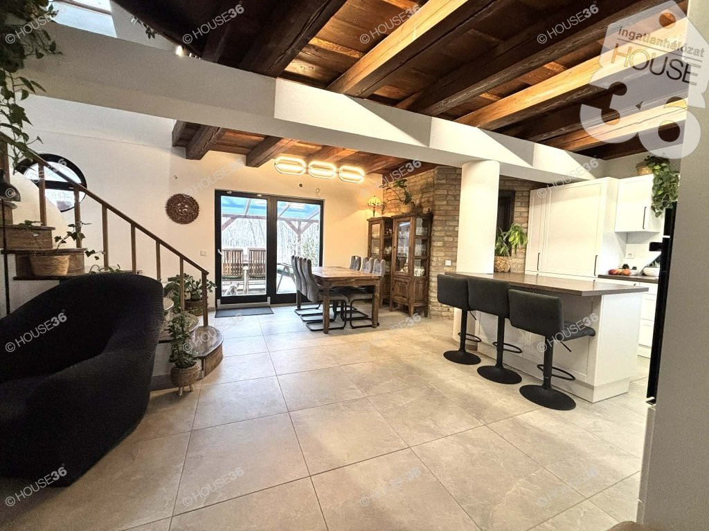 A ház igazi értéke a hangulata: látszó fa gerendák, bontott tégla részletek és egy kemence teszik otthonossá és egyedivé.